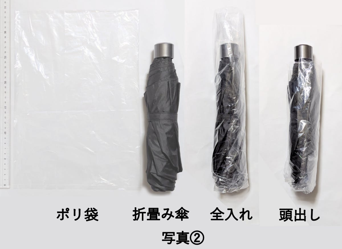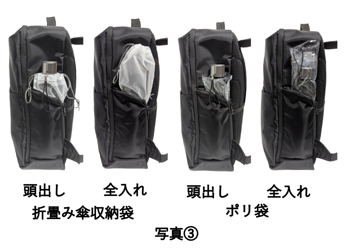 こちらでも柄の部分はあまり濡れないし、リュックに入れた時に袋が出ない方が良いという場合は、写真②の頭出しの画像のように、収納袋の底を数cm折り返して柄を出すと、リュックに入れた時に、写真③の右から2つめの画像のようになります。毎回折返すのが面倒ということでしたら、予めポリ袋の上の方を切り落としておくというのも1つです。