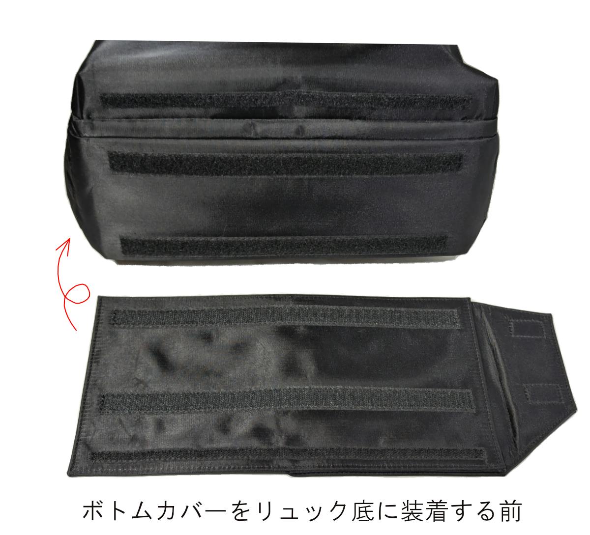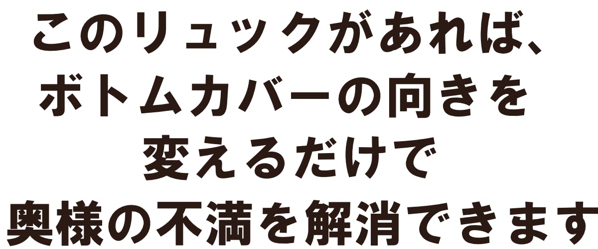リュック底のボトムカバーの向きを変えるだけで、屋外で下に置いた時についた汚れなどを覆って、ご自宅を汚さないで済むようになって、奥様の不満を解消できます。
