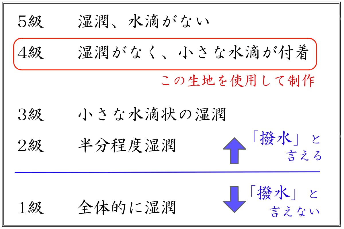 ※試験方法:生地に水スプレーを掛けてから、固い物に軽く当て水滴を落とし、その生地にどれだけ水分が残っているのかで等級を判定。