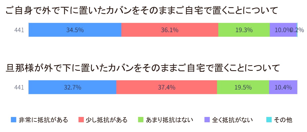 弊社で30~50代の既婚女性441人に対して行なったアンケートでは、自ら外でカバンを下に置いた場合も、旦那様が置いた場合も、カバンを自宅でそのまま置くことについて、「非常に抵抗がある」と「少し抵抗がある」と回答した方が合計で約7割で、2/3を超えます。