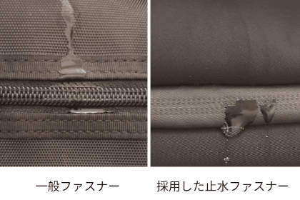 その点、浸水止めカバーがついている止水ファスナーなら、ファスナーの生地から水が浸み込みにくくすることができます。