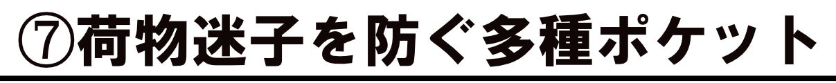 サイドポケット以外にも、各種のポケットをとりつけています。そのため、モノがリュック内で迷子になりにくくなります。