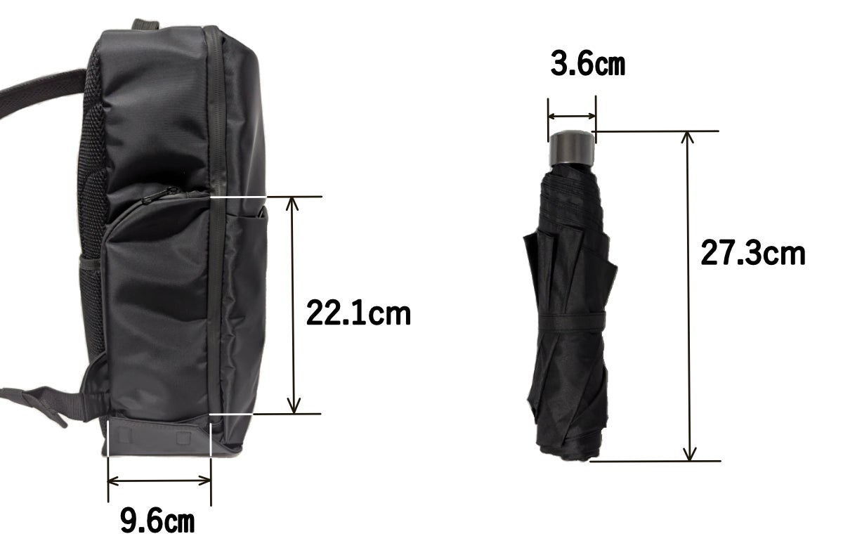 その点、上の写真の中央と右のように、折畳み傘を袋に入れてサイドポケットに入れておけば、傘の扱いに困ることもなくなります。