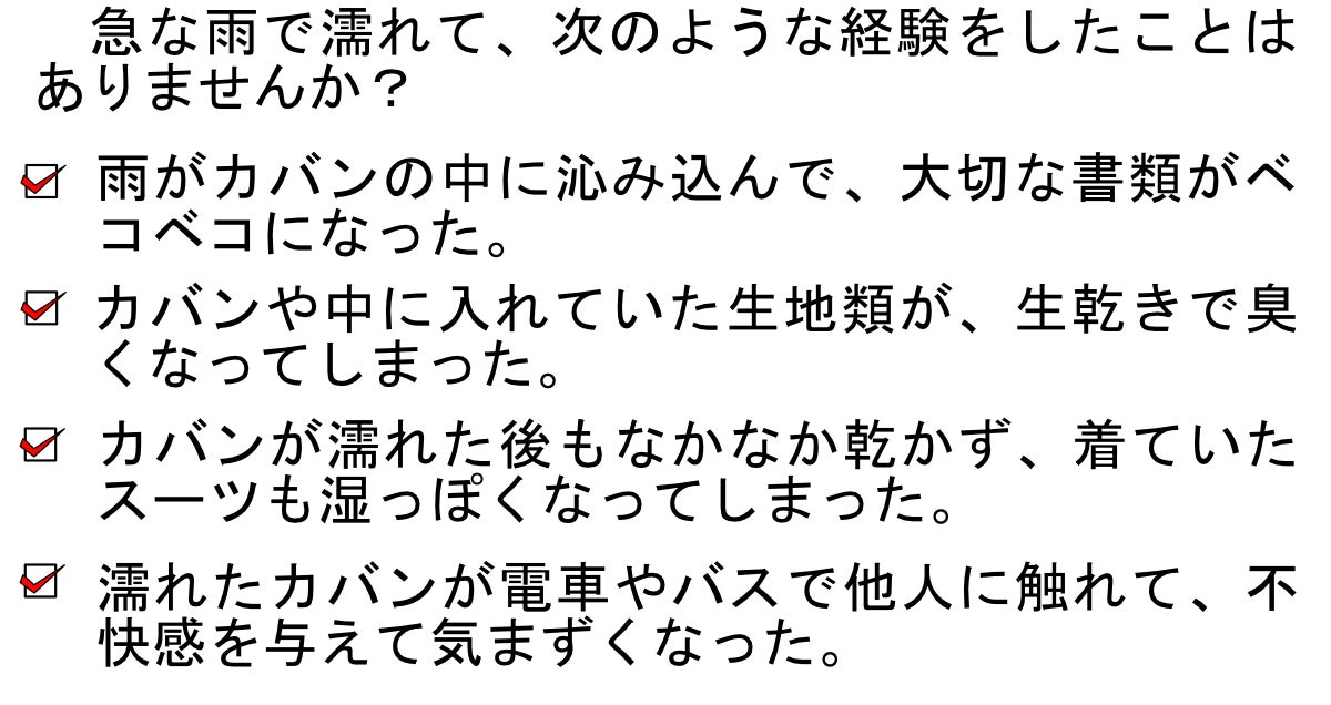 雨の中でカバンを開けて見たい時でも、置ける場所が濡れているところばかりだと、カバンが濡れてしまうので置きづらくなります。