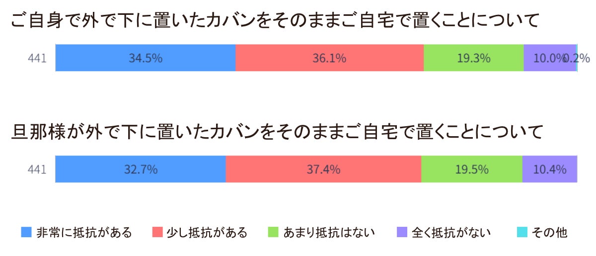 弊社で30~50代の既婚女性441人に対して行なったアンケートでは、下に置いたカバンを自宅でそのまま置くことについて、「非常に抵抗がある」と「少し抵抗がある」と回答した方が合計で約7割となりました。
