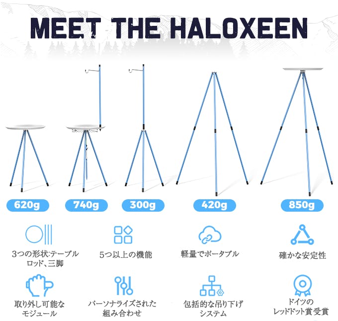 • 世界3大デザイン賞を受賞したHALOXEENが日本上陸!Kickstarterで約1,000万円売れた人気のキャンプギアです!販売は5月31日まででの日本先行販売で、特別な限定セットも今回無償特典(約6,000円相当)でついてきます!!日本先行販売は今回が最後となり、次の販売は未定となっております。使い方は今お持ちのギアにプラスして、サイドテーブルや焚き火台、カメラの三脚などにも使えるので、キャンプシーンから登山やハイキングなどでも活用できます!もちろん軽量なので、負担も少ないかつ頑丈なアルミ合金素材となりますので安心してご活用できます!ぜひ、今お持ちのキャンプギアにプラスアルファ、そして屋内インテリアとしても使えるサイドテーブルとして、屋内外で使えるギアをこの機会に応援購入していただきたいです!お届けは7月末までのお届けを想定しております!5月31日まで何卒宜しくお願い致します! もっと見る