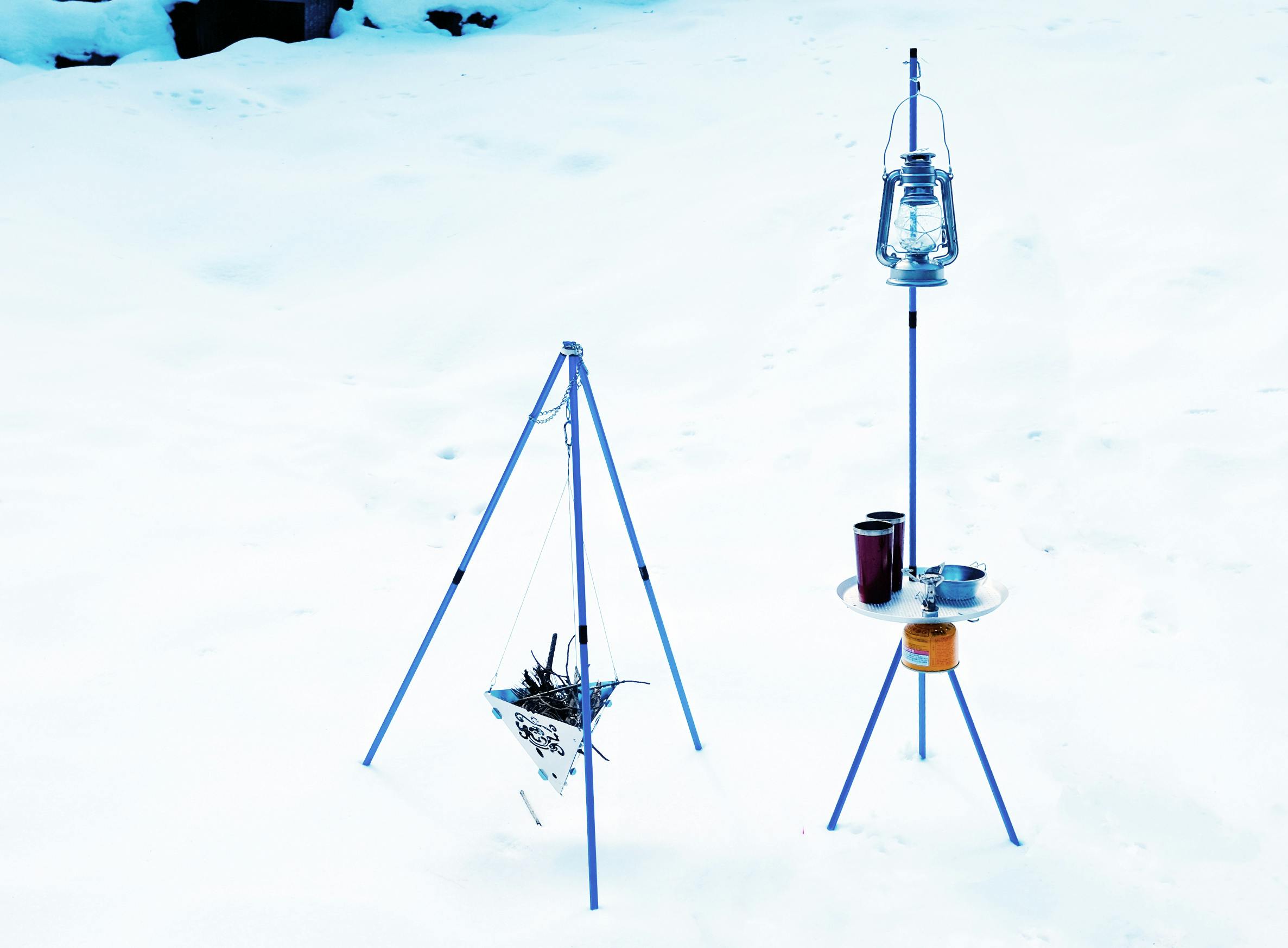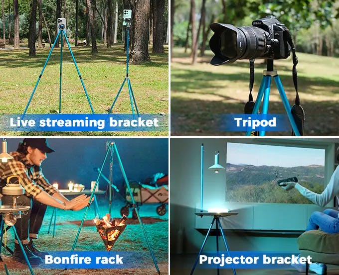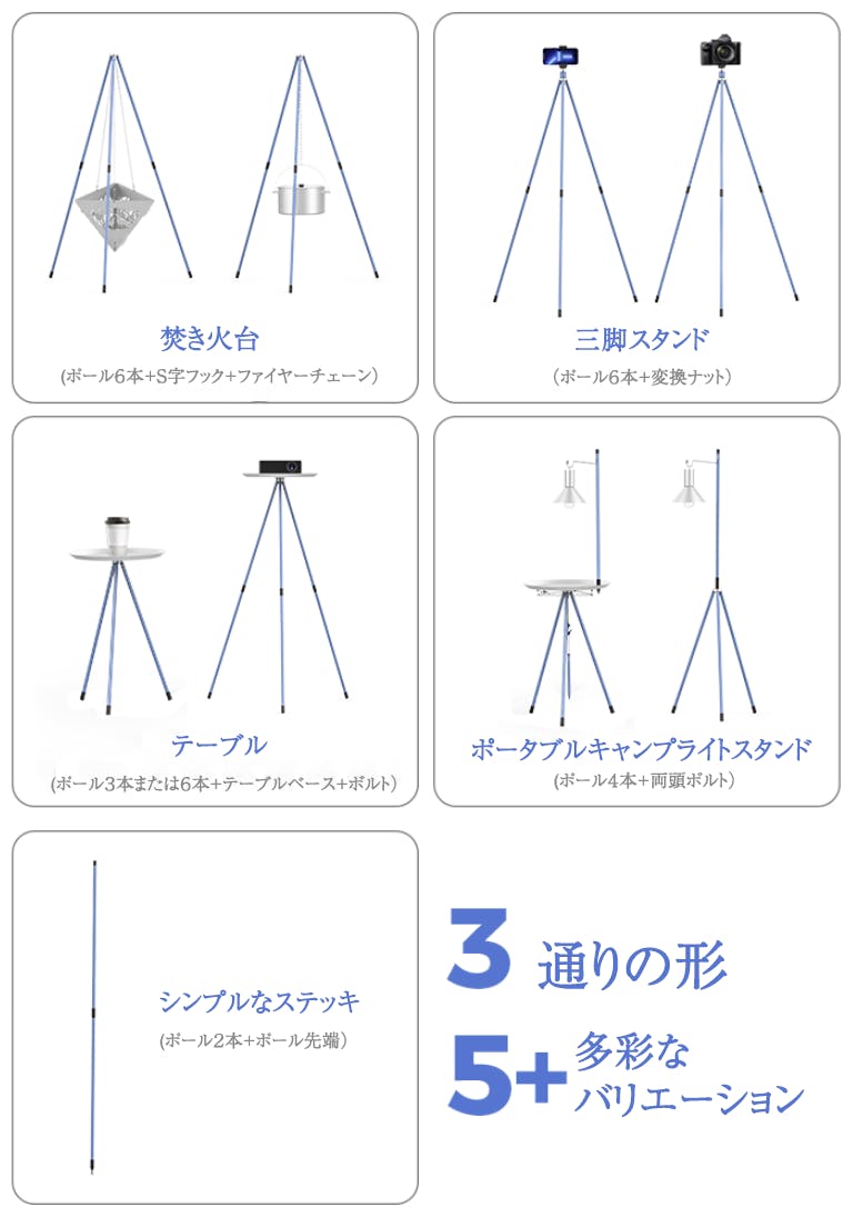 A キャンプでのテーブルとしての使用、ランタンを吊るしての照明、焚き火台としての使用、カメラの三脚としての使用、トレッキング時のステッキとしての使用など、様々なシーンで活用できます。