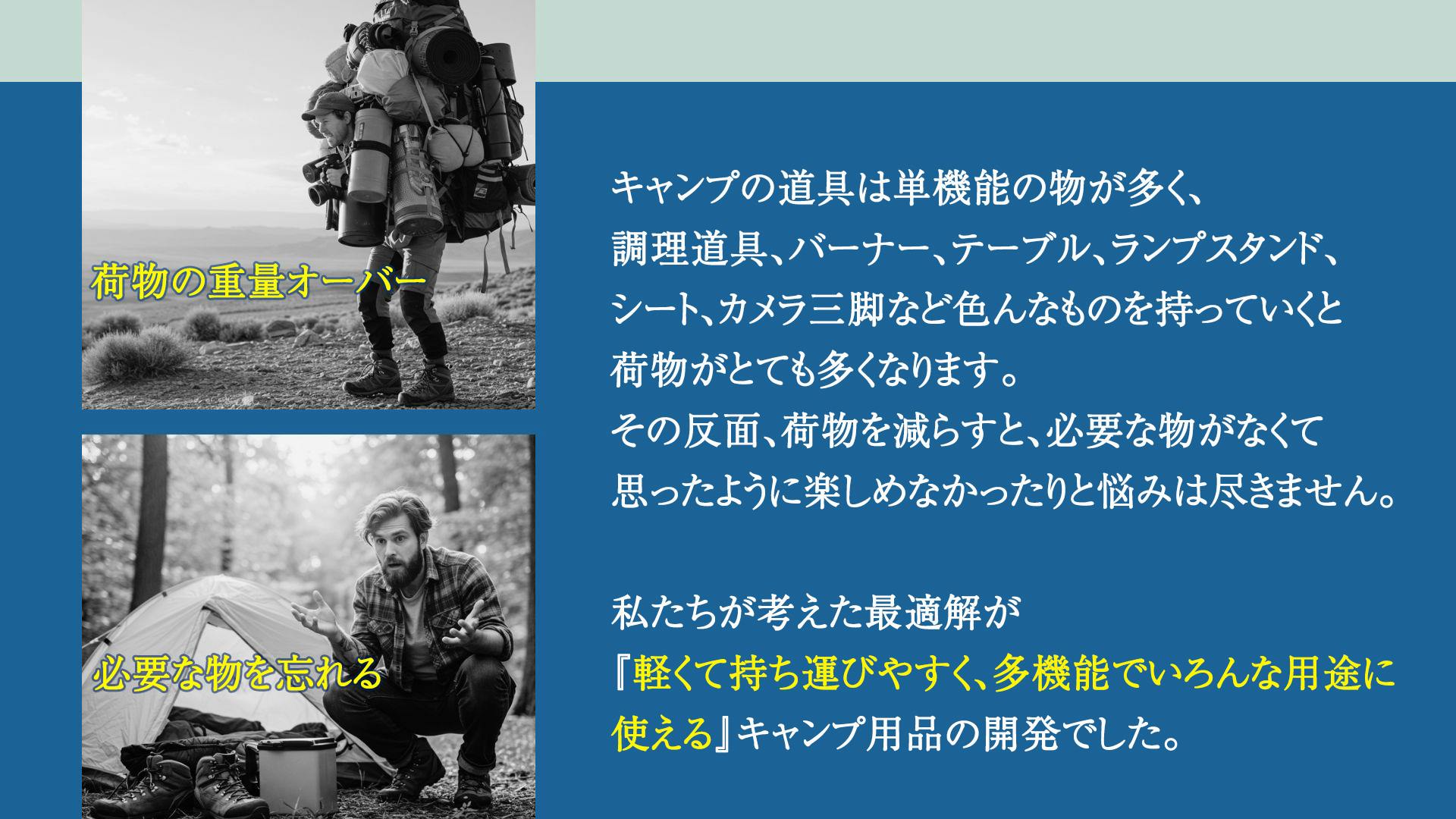 現代社会は物に溢れ、その重圧から逃れるために大自然に飛び込むはずが、逆に持っていくキャンプギアの多さに縛られてしまう。これでは、本当の癒しや自由は得られないのではないか。そんな疑問から、私たちの挑戦が始まりました。