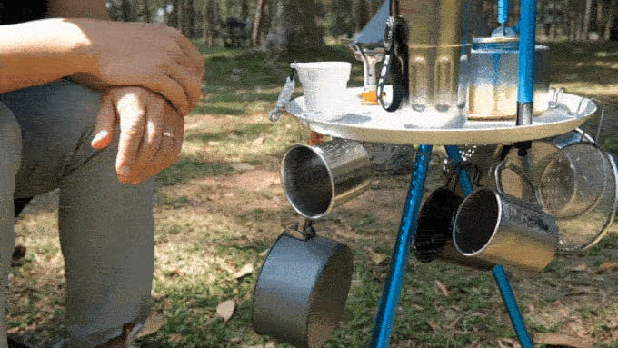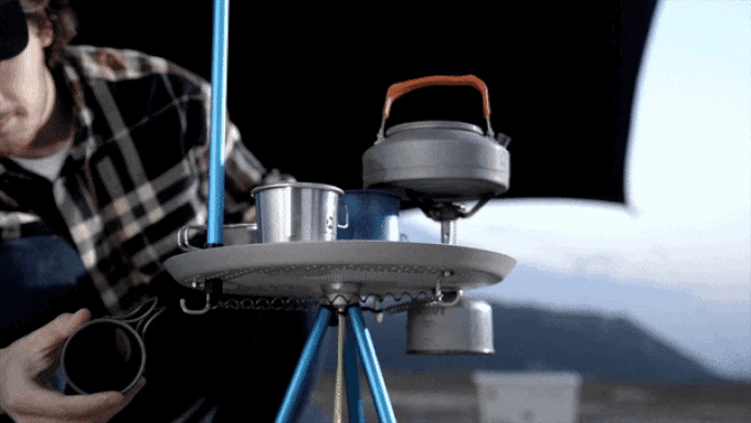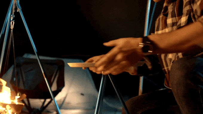 もちろん、単なる焚き火台ではありません。はめ込み式の天板を取り付けることで、シェラカップでお湯を沸かしたり、フライパンなどで簡単な調理もできます。