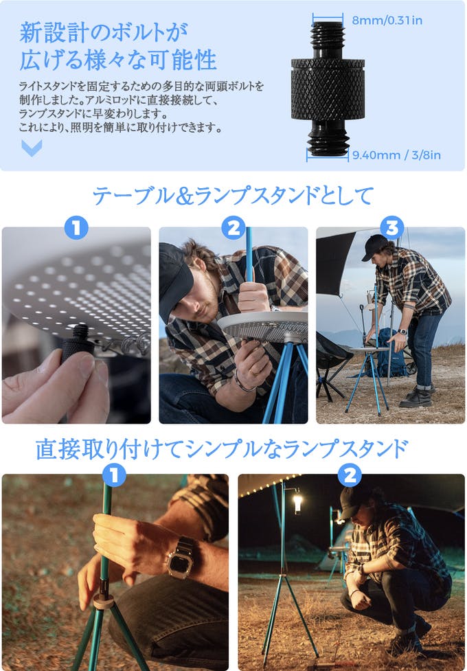 テーブルを支え、焚き火の安全を守り、夜の闇を照らし、シェルターを構築し、思い出を記録し、あなたの歩みを助ける—これらすべてに共通して存在していたのは、同じアルミニウムの棒でした。