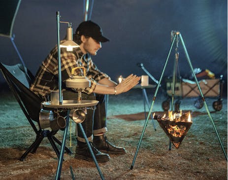 『HALOXEEN』は、そのコンセプトを体現しています。たった一つのギアが、テーブル、ランプスタンド、焚き火台、三脚、ストーブスタンド、そして収納棚へと姿を変える。これにより、あなたのキャンプはシンプルになり、その分、自然との一体感やリラックスが増すのです。