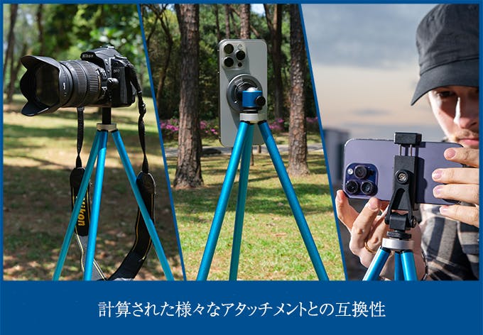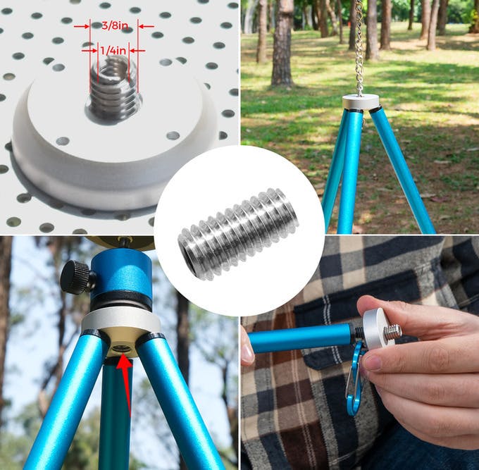 写真撮影機材やスマートフォンのライブラリーストリーミングマウントとの互換性を確保するため、上部の絞りは3/8インチに設定されています。(ジンバルなどとの互換性を確保するため、3/8から1/4への変換ボルトが別途付属しています。)