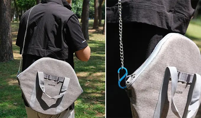収納ケースはクッションなどの使い方やカラビナ付きチェーンも肩からかけるショルダーチェーンとして使うこともできます。