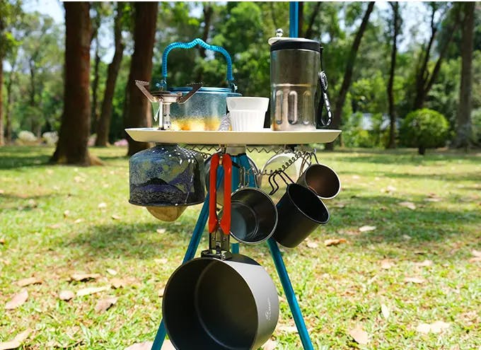 更にテーブルの下部には取り外し可能なワイヤーを取り付け、シェラカップなど様々な物をひっかけることができます。