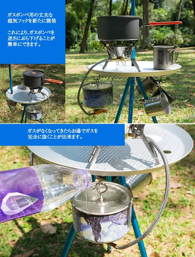 このシンプルで大胆なアイデアが、あなたのアウトドア体験を劇的に変えます。機能性はそのままに、足元やテーブル周りのスペースをすっきりと解放。限られた空間でも、調理や食事を存分に楽しめます。
