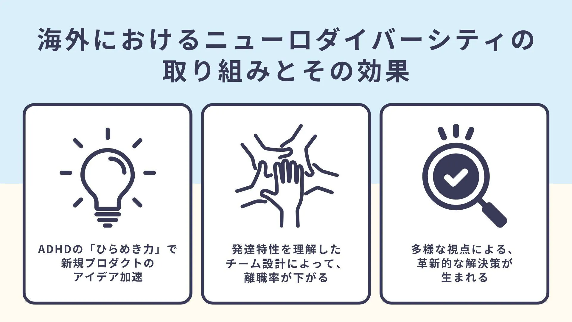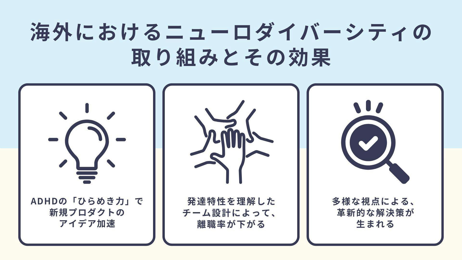 そこでは、ADHDの「ひらめき力」が新規プロダクトのアイデアを加速させたり、多様な視点によって革新的な解決策が生まれたり、発達特性を理解したチーム設計によって離職率が下がったり、といった具体的な成果も報告されています。