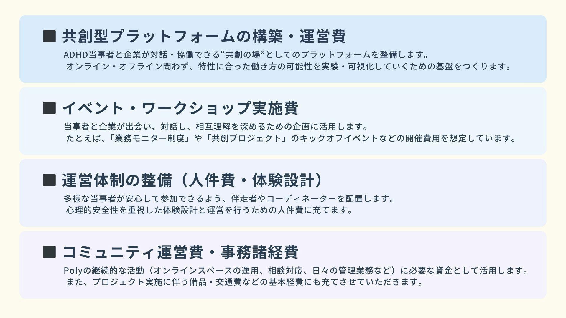 集まったご支援はすべて、ADHDの当事者が「自分らしいかたちで社会とつながる」ための実践型プラットフォーム「Poly」の基盤構築と、企業との共創プロジェクト実現のために大切に活用させていただきます。