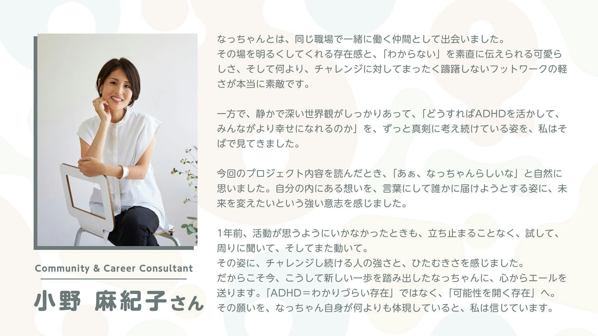 そして私自身、高校時代の不登校、大学時代の躁うつ・ADHDの診断といった経験を通じて、自分自身の「できなさ」や「違い」に深く悩みましたが、強みや仲間と出会い、今は自分らしく、前を向いて活動できています。