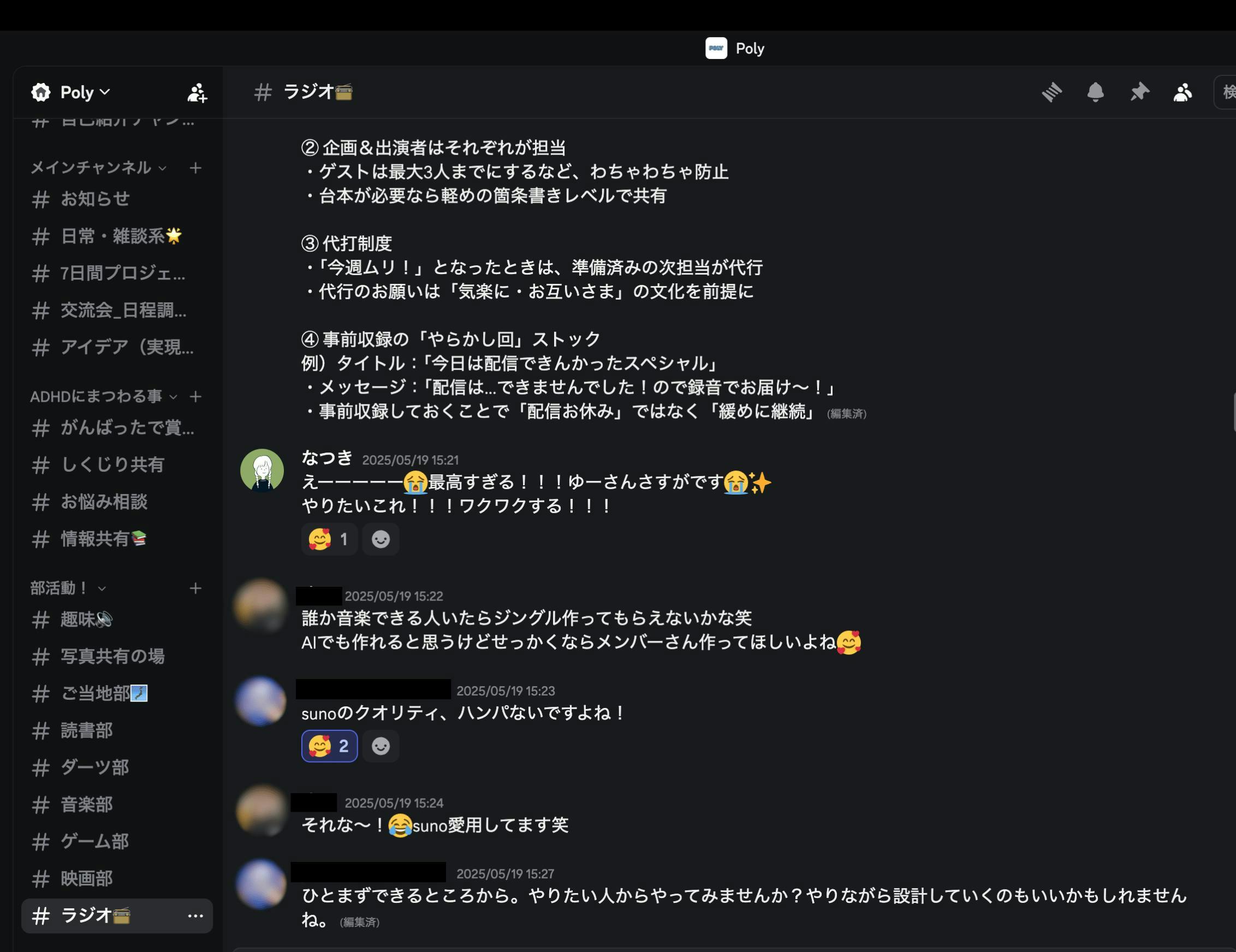 実際にPolyの中では、失敗体験ばかりでネガティブになっていたメンバーも、少しずつ自分のアイデアを形にし始めたり、「やってみたい」に一歩踏み出す瞬間が生まれ始めています。