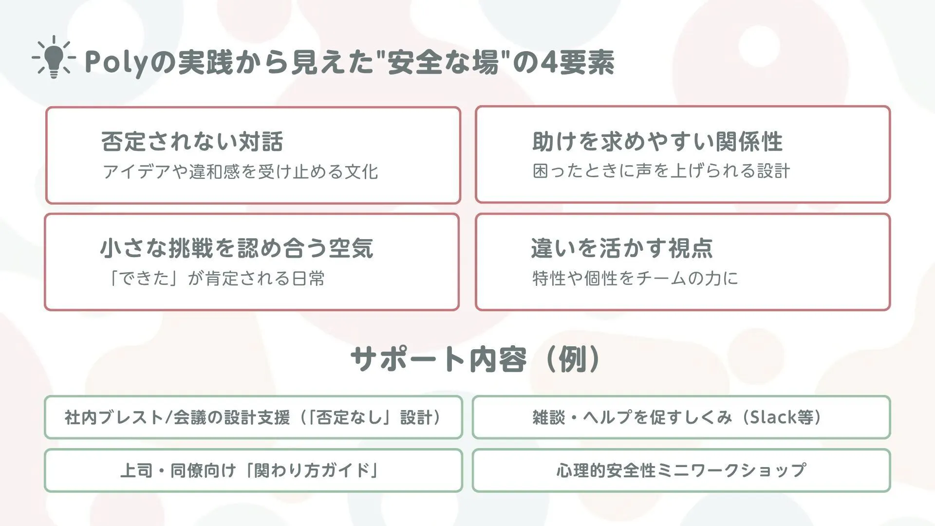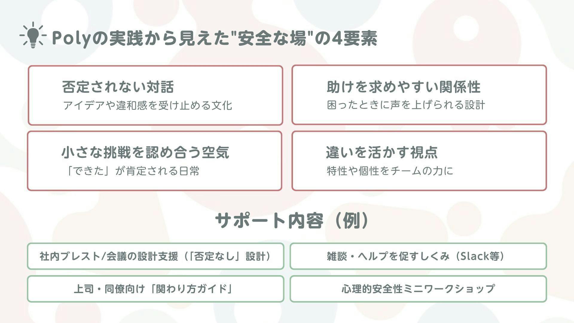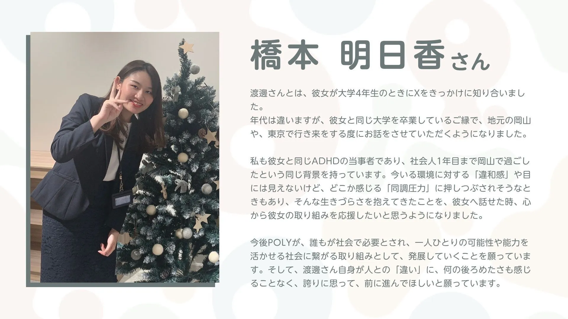 そのため、Polyで培ってきた実践をもとに、ADHDの有無に関わらず、すべての人が力を発揮できるような心理的安全性を、企業や組織の中にも根づかせていきたいのです。