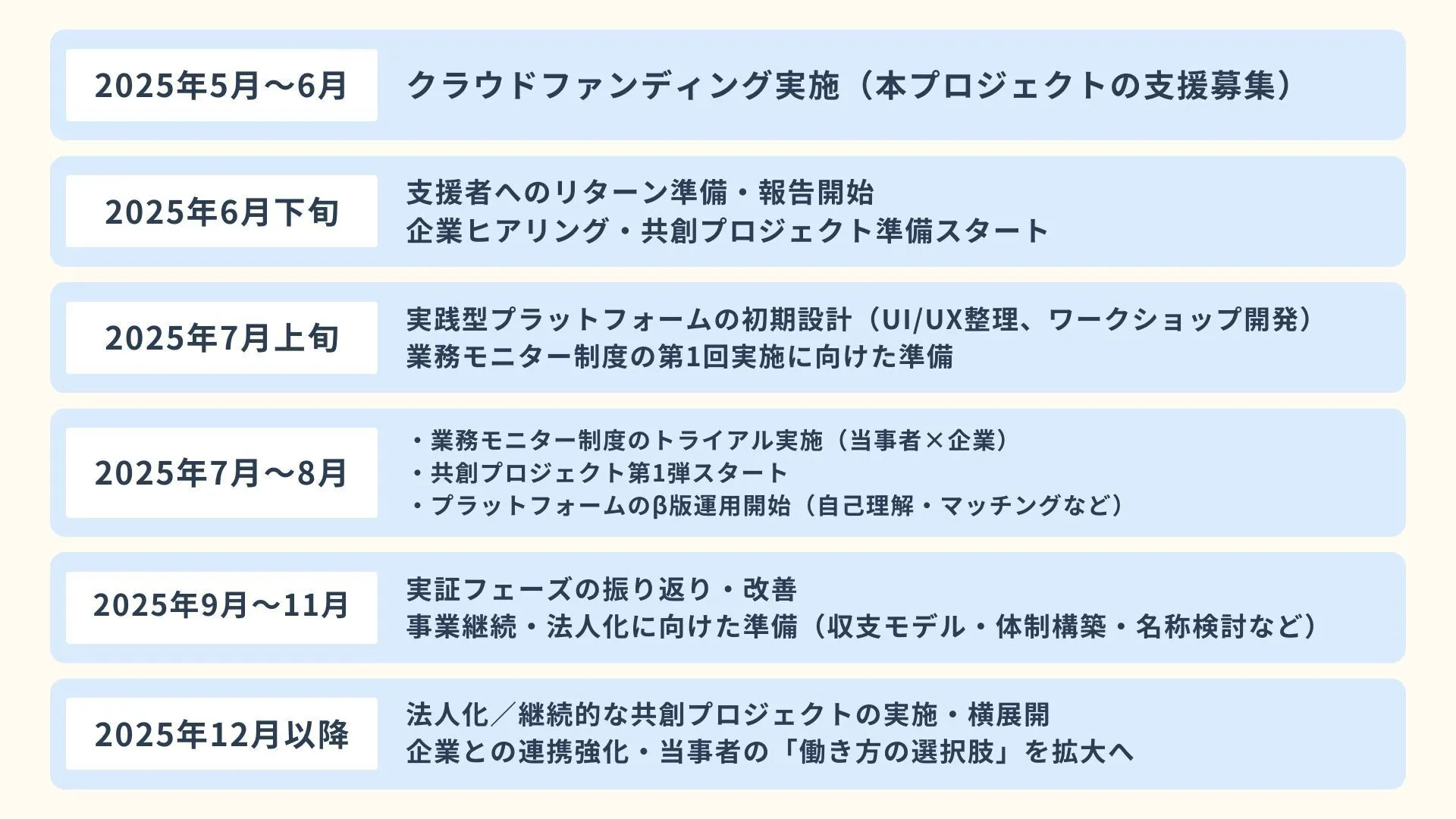 この取り組みは、クラウドファンディングの終了後も継続して発展させていく予定です。現在は任意団体・コミュニティとして活動していますが、今後は法人化も視野に入れ、より多くの当事者と企業をつなげるための仕組みとして進化させていきます。