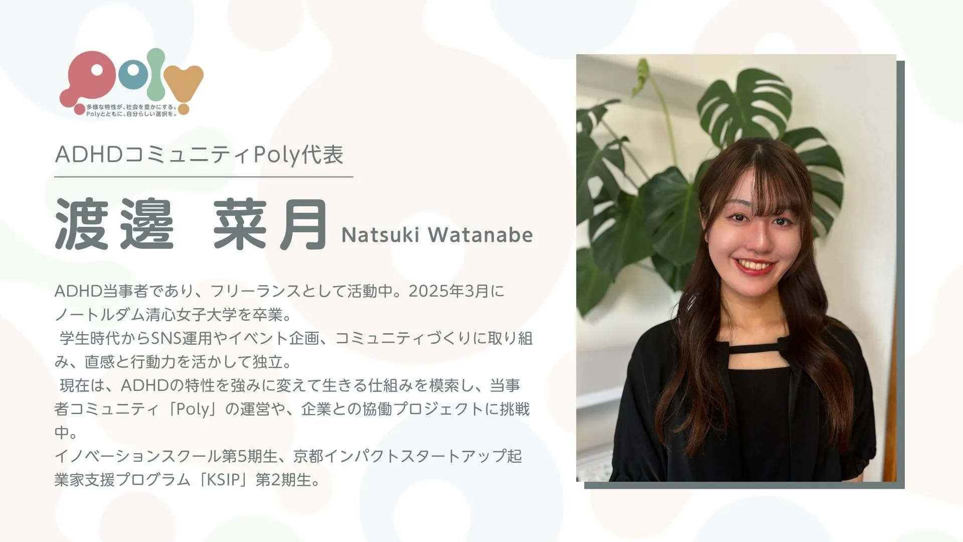 改めまして、渡邊 菜月(わたなべ なつき)と申します。2025年3月にノートルダム清心女子大学を卒業し、現在は岡山を拠点に、フリーランスとしてデザインや広報、企画などに携わりながら、ADHD当事者コミュニティ「Poly」を運営しています。