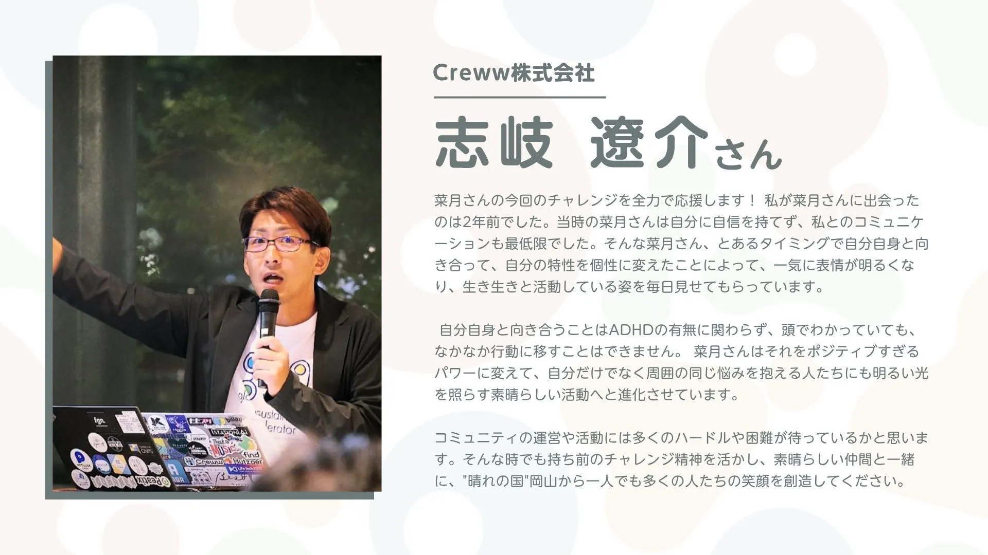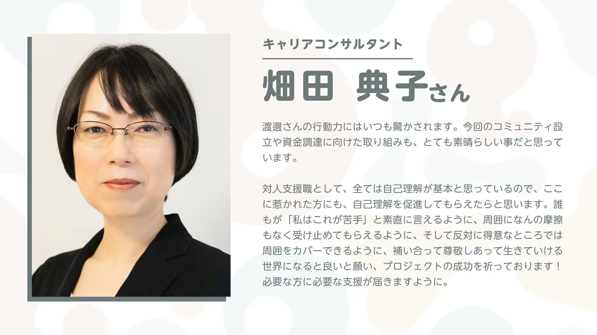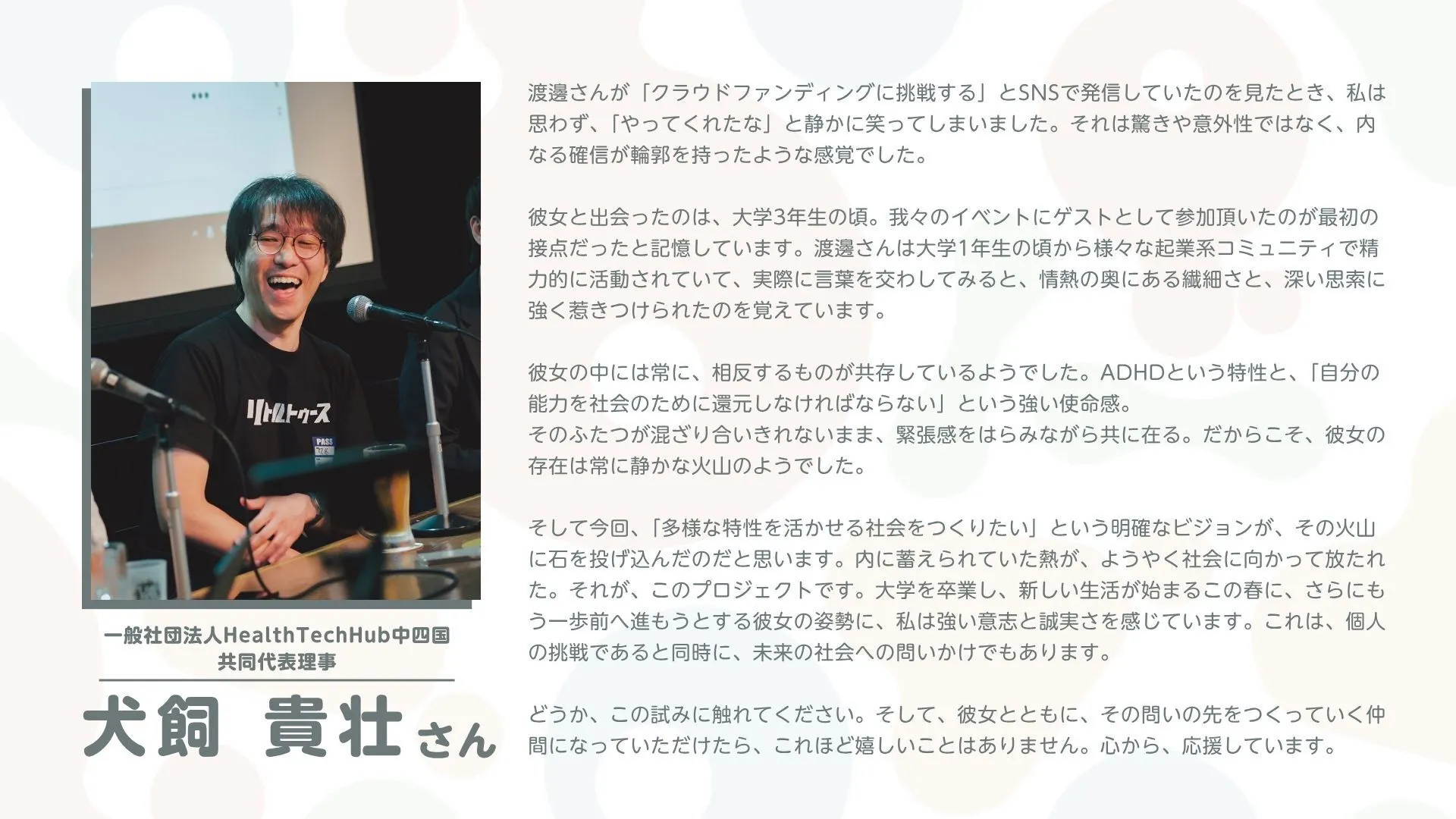 この挑戦は、まだ始まったばかりです。だからこそ、あなたの力を貸していただけませんか? あなたの応援の一つひとつが、これから出会う多くのADHD当事者にとっての、“自分らしく社会で輝ける選択肢”を増やす、大きな力になります。