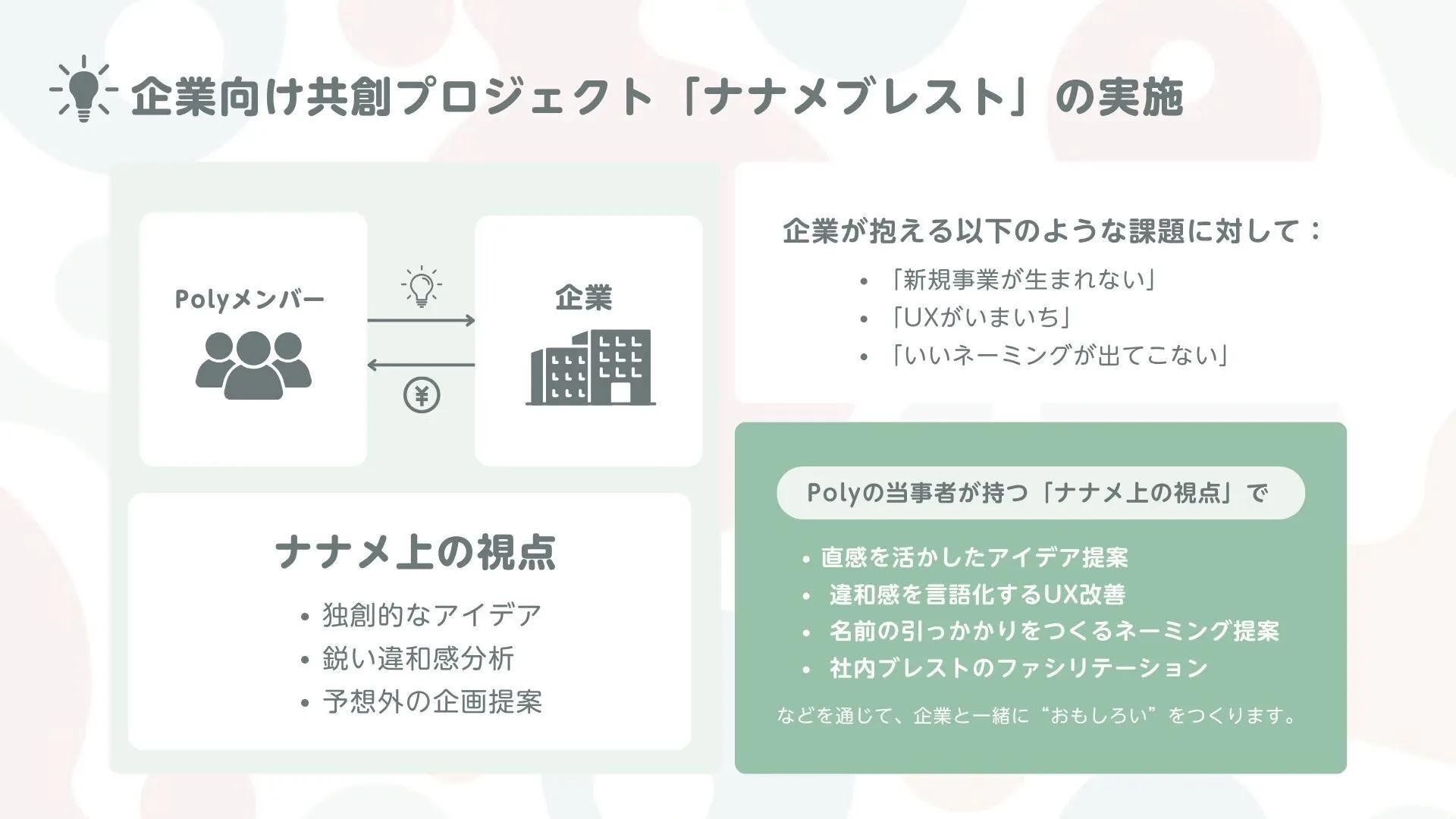 などを設計・実施していくことで、Polyという安心できるコミュニティの土壌を活かし、当事者と企業が“わからなさ”ごと共に考え、“強み”を見つけながら関われる仕組みを、社会にひらいていきます。