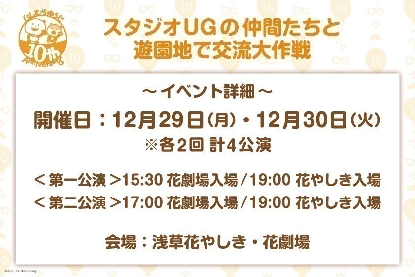 2026/01/07 18:00こんにちは!広報課 補佐部員の「さとう」です!イベント「スタジオUGの仲間たちと遊園地で交流大作戦」は12/30(火)に無事終了いたしました。皆さまにプロジェクトを見守っていただき、当日は着ぐるみたちが元気いっぱいに登場することができました。年末のお忙しい時期にもかかわらずご参加いただいた皆さま、本当にありがとうございました!【イベント収録動画について】イベント収録動画の視聴リンクとパスワードの配信は1月中旬を予定しております。現在チケット販売サイトフリッパにて視聴チケットのお申し込みが可能です。◼︎チケット受付期間:〜2026/1/9 23:59まで視聴チケットお申し込みはこちら【集合写真について】イベント内で撮影いたしました集合写真は、イベント招待状に記載しておりますQRコードよりダウンロード可能です。【遺失物お問い合わせ先】会場内で落とし物をされた方は、浅草花やしきHPよりお問い合わせください。https://www.hanayashiki.net/lostsinfo/ もっと見る