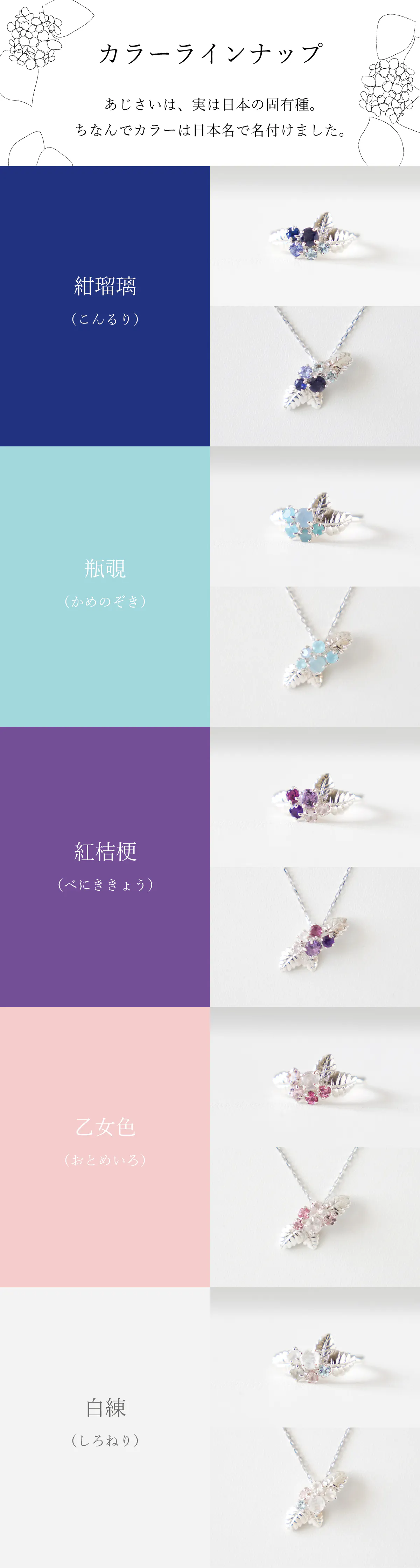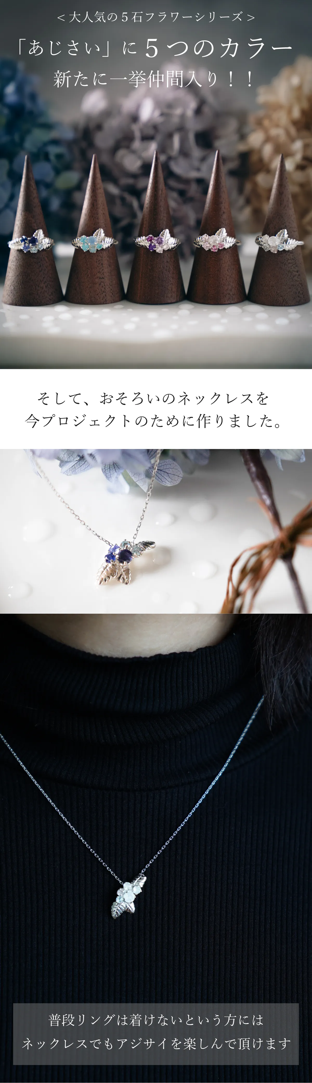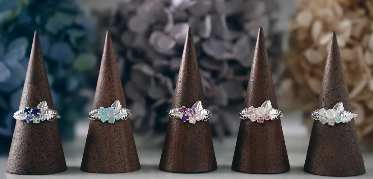 大人気のあじさいリングの天然石を変え、一挙に5種類のカラーを作りました!土壌によってカラフルに変化するあじさいをジュエリーで楽しむことが出来ます◎また、今回のためにおそろいのネックレスを初製作!日本のものづくりを堪能できる、美しいあじさいジュエリーをお迎えください。