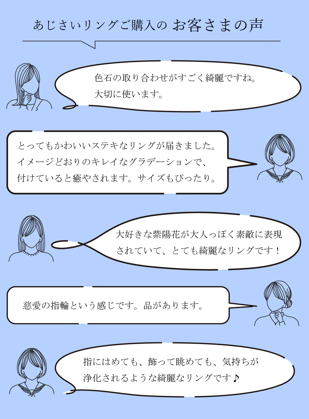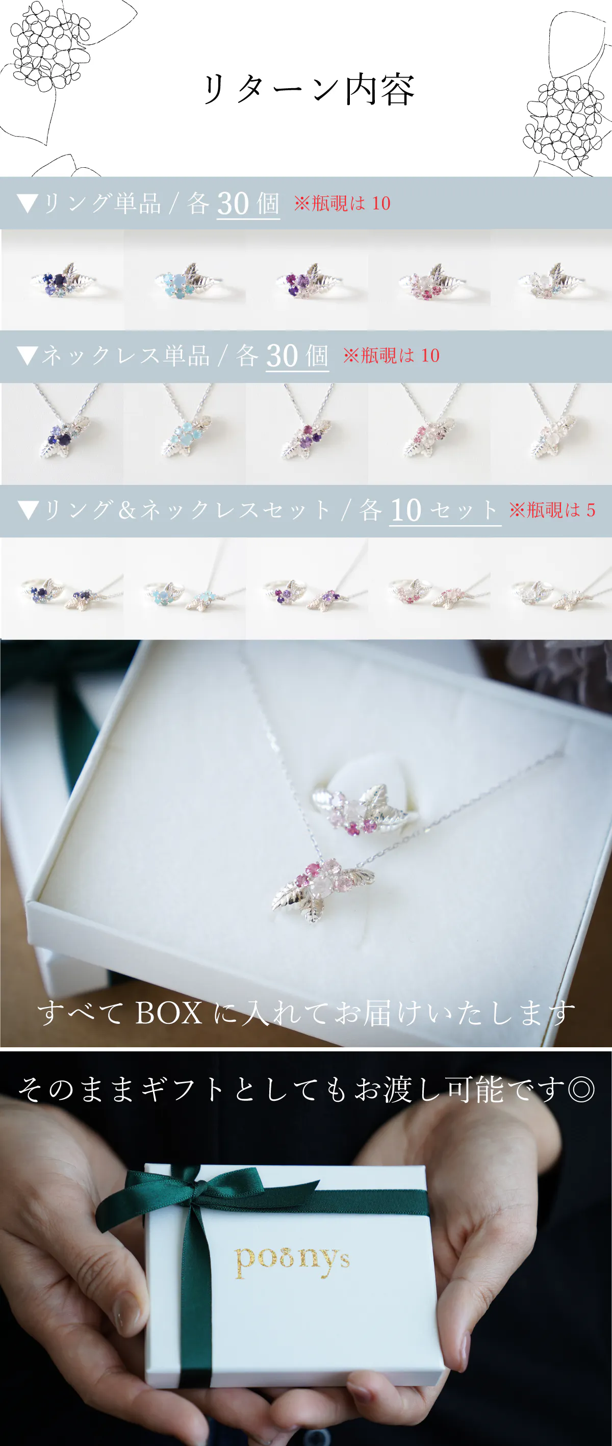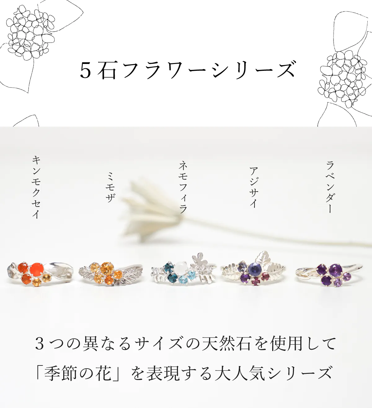 大人気のあじさいリングの天然石を変え、一挙に5種類のカラーを作りました!土壌によってカラフルに変化するあじさいをジュエリーで楽しむことが出来ます◎また、今回のためにおそろいのネックレスを初製作!日本のものづくりを堪能できる、美しいあじさいジュエリーをお迎えください。