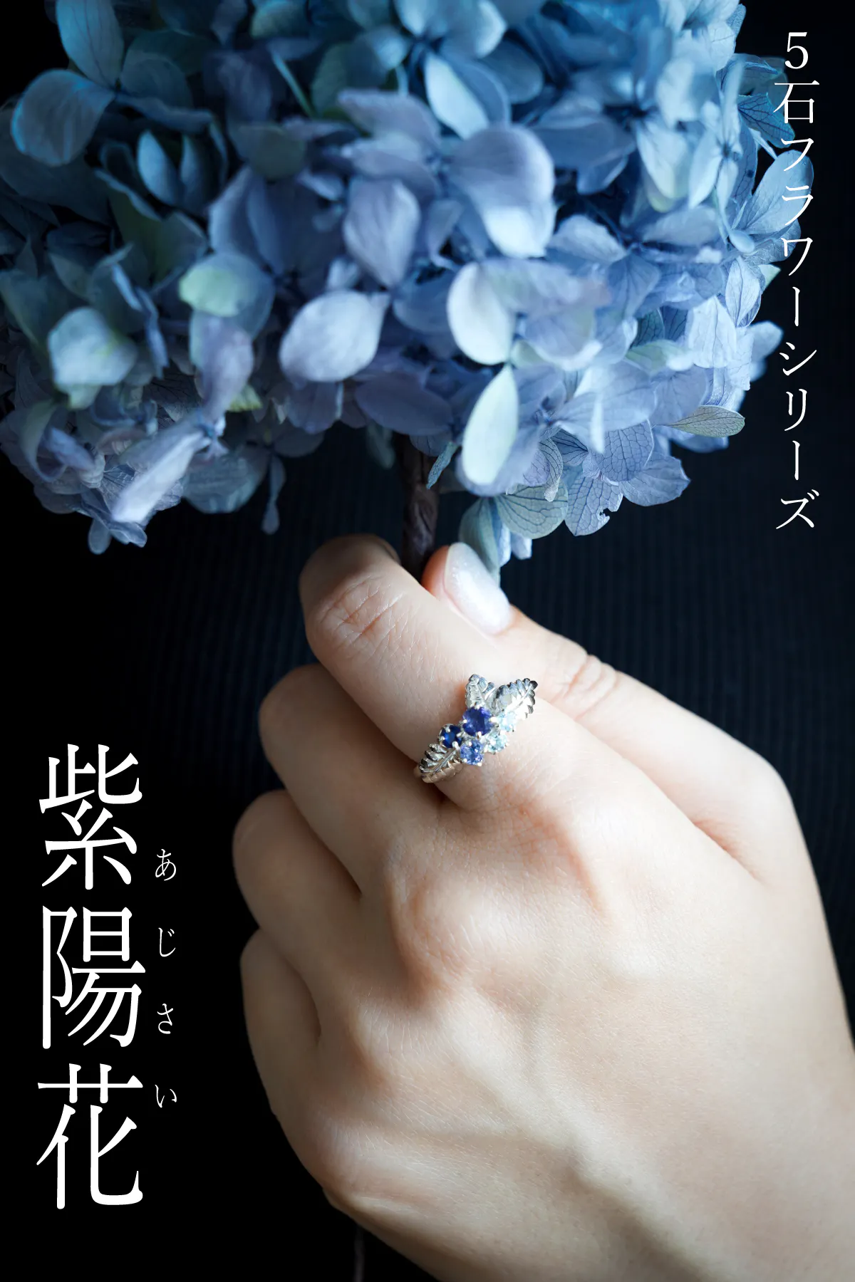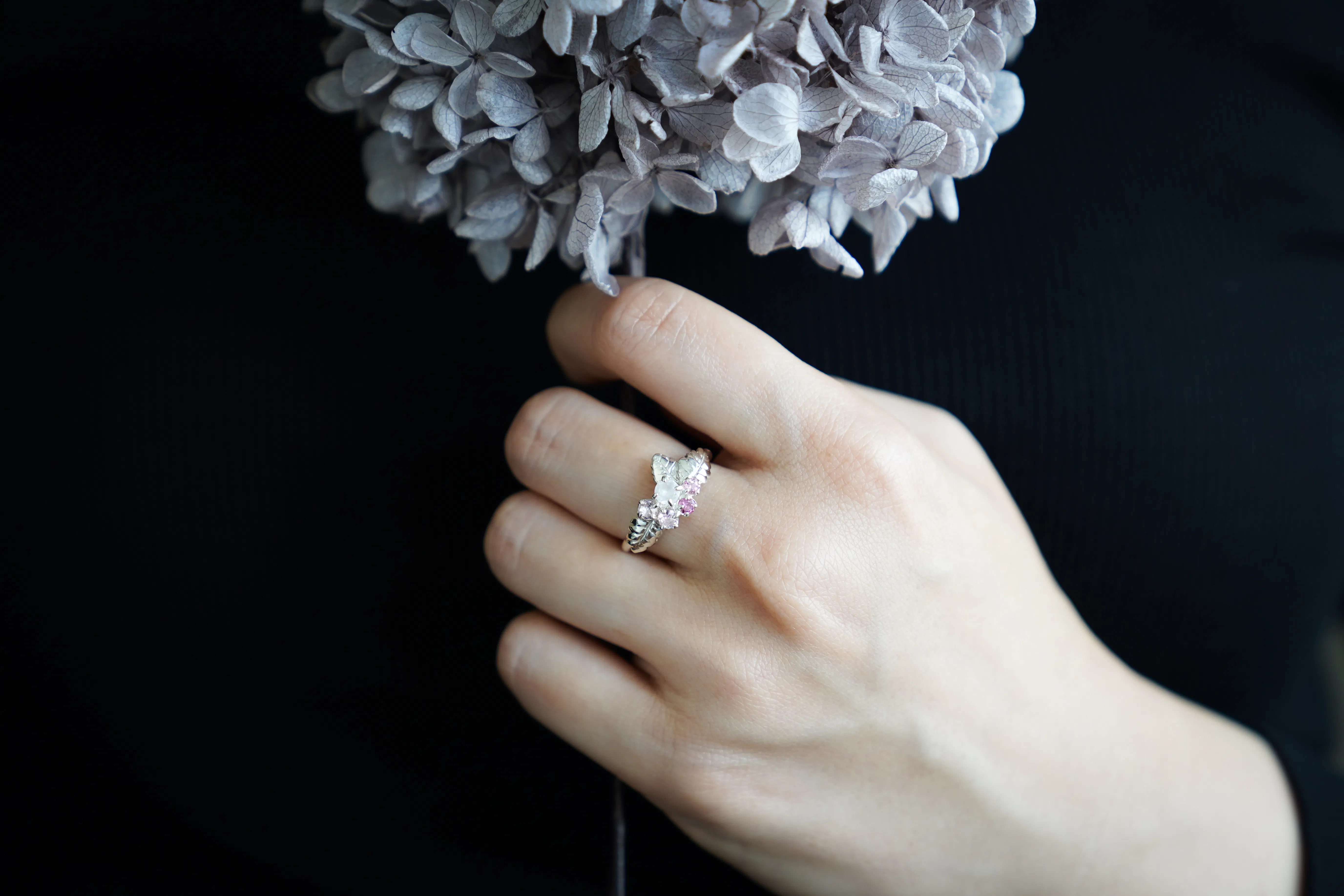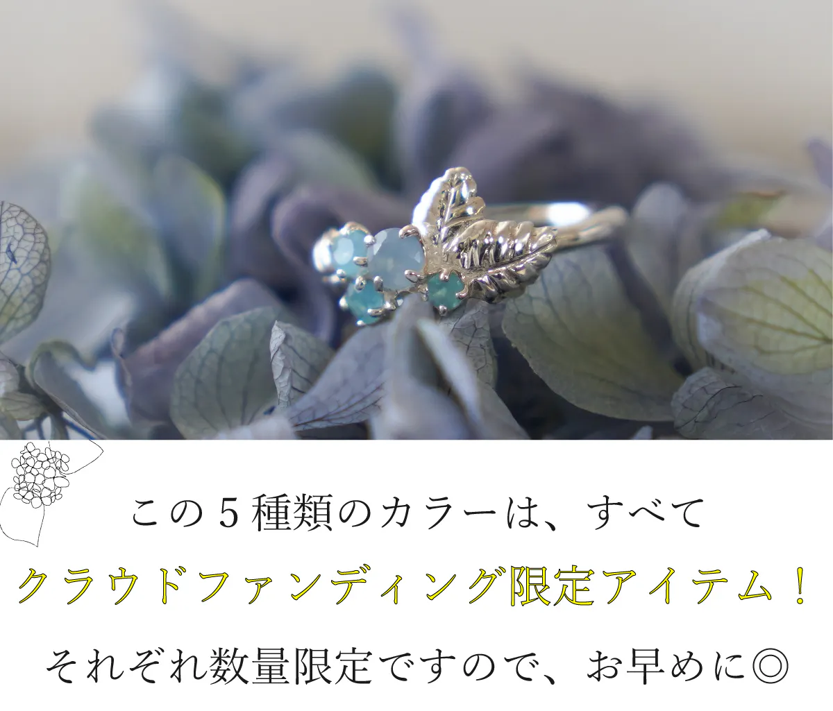 本プロジェクトは、このORIGINALのあじさいリングの天然石を変え土壌によってさまざまな色に変身するアジサイをさまざまな組み合わせで表現したジュエリーにして皆さまにお届けいたします。