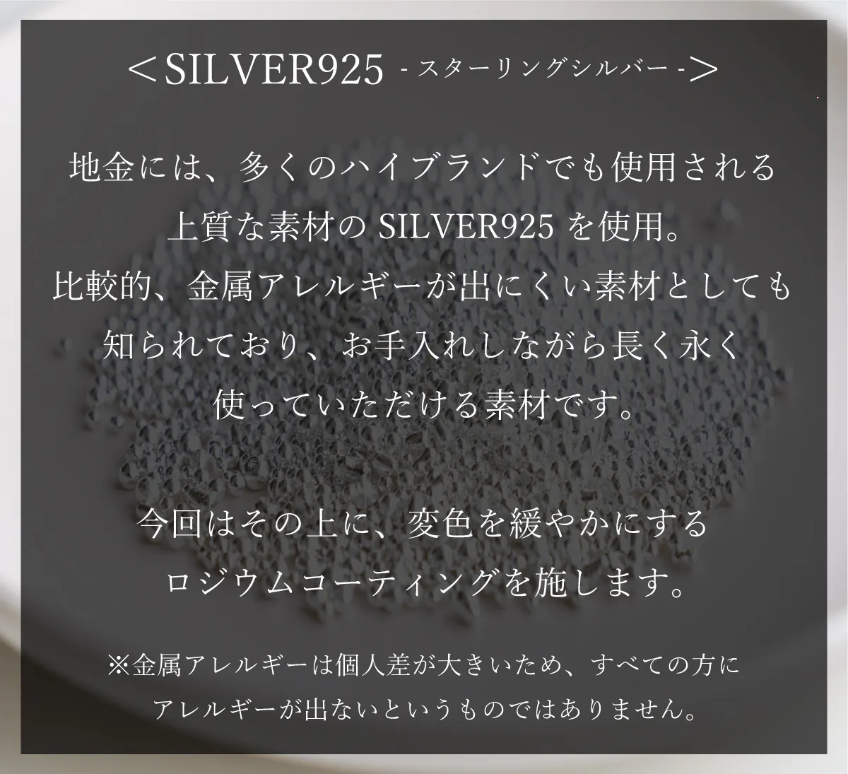SILVER925は、汗や皮脂・ほこりなどと空気が反応し黒く変色いたします。ロジウムコーティングも経年で剥がれてきてしまいますので、変色やキズなどが気になった際にはクリーニングをおすすめいたします。状態によりますが、ある程度新品同様に仕上げ直すことが出来ますので個別でお問合せ下さいませ。