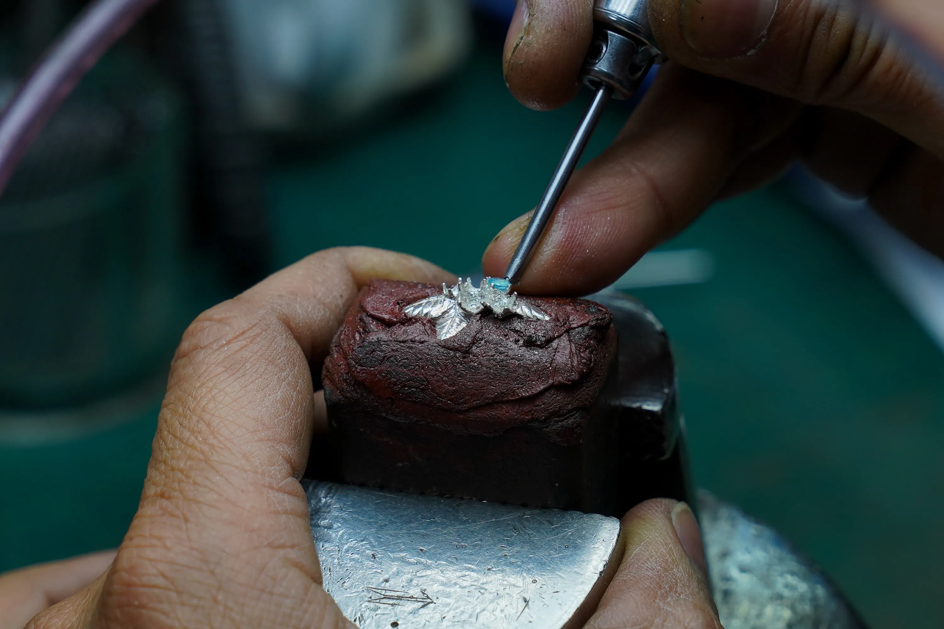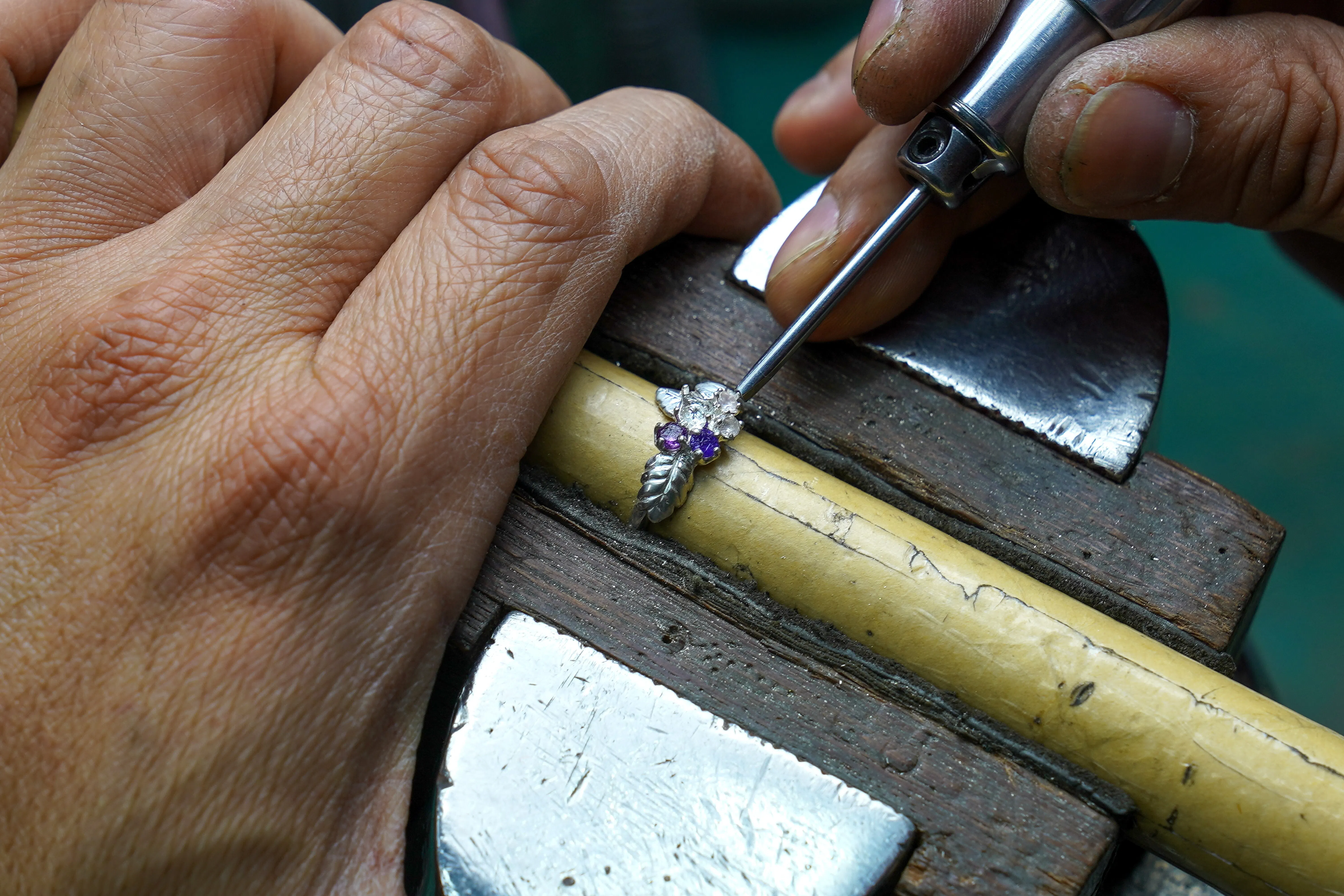ミモザやラベンダーなどは5石すべてを同じ天然石を使用していますが、石にはカラーの濃淡に個性があるためそれを活かしてグラデーションのようにさまざまな色合いのものを設置しています。