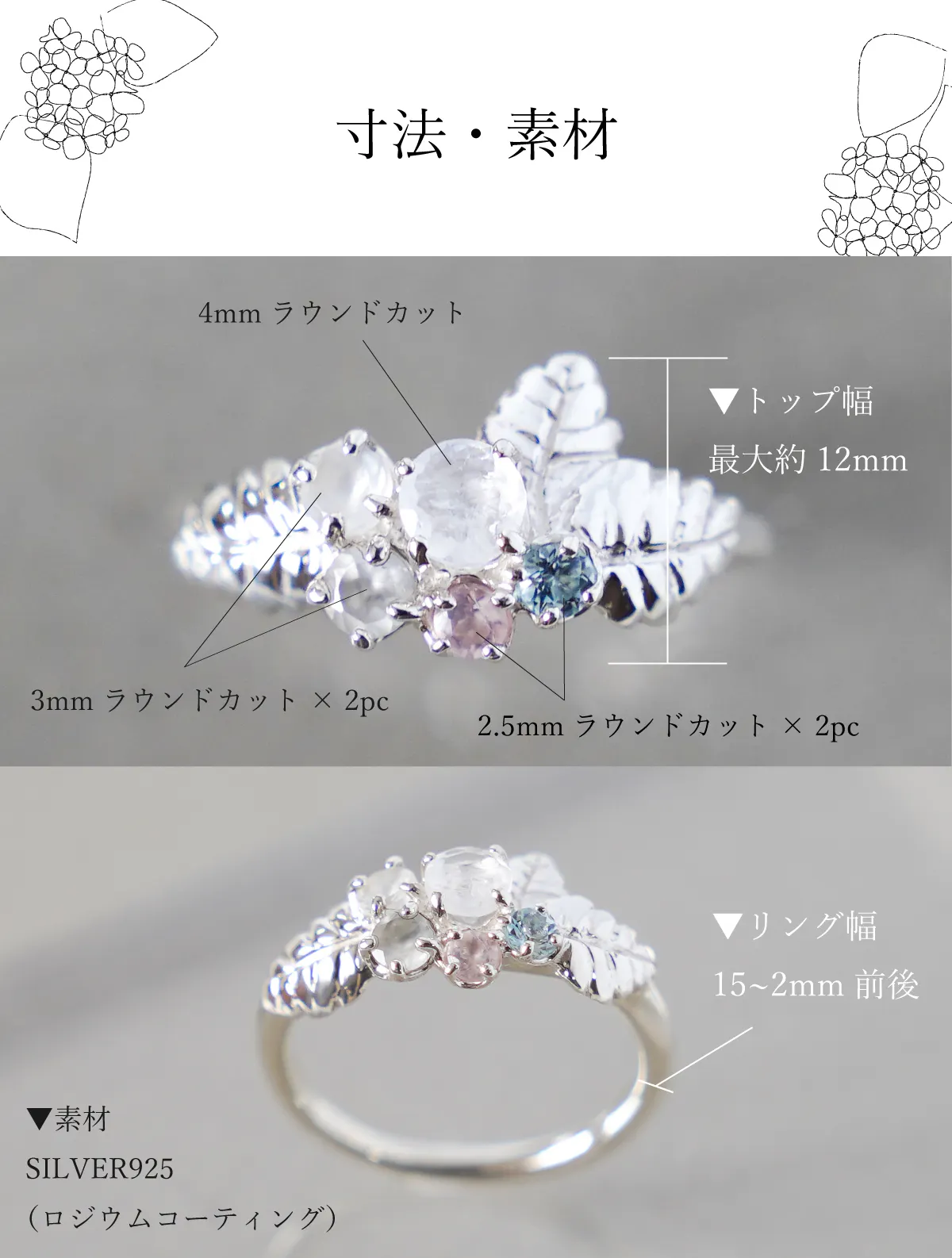 一番大きな石が4mm×1pc。次に3mm×2pc2.5mm×2pc計5石を使用しています。