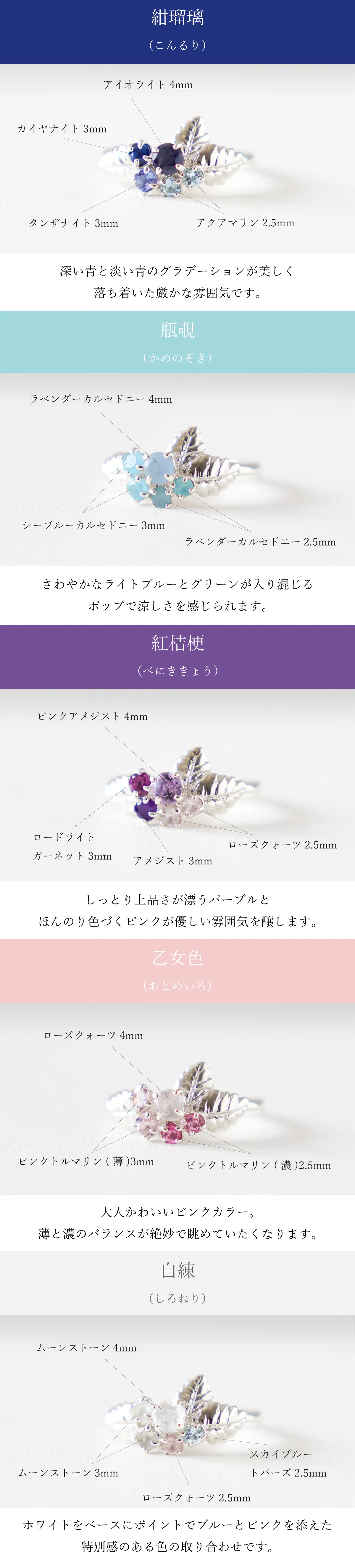 特に「瓶覗(かめのぞき)」で使用している天然石は、個々の個性が強いため色味に差が出やすいです。その分すべてが一点物と違わないため、どのような色合わせがお手元に届くのか楽しみにして頂ければと思います。お届け後に石を変えて欲しいというご要望にはお応えできかねますので、上記注意事項をご了承の上お求めくださいませ。