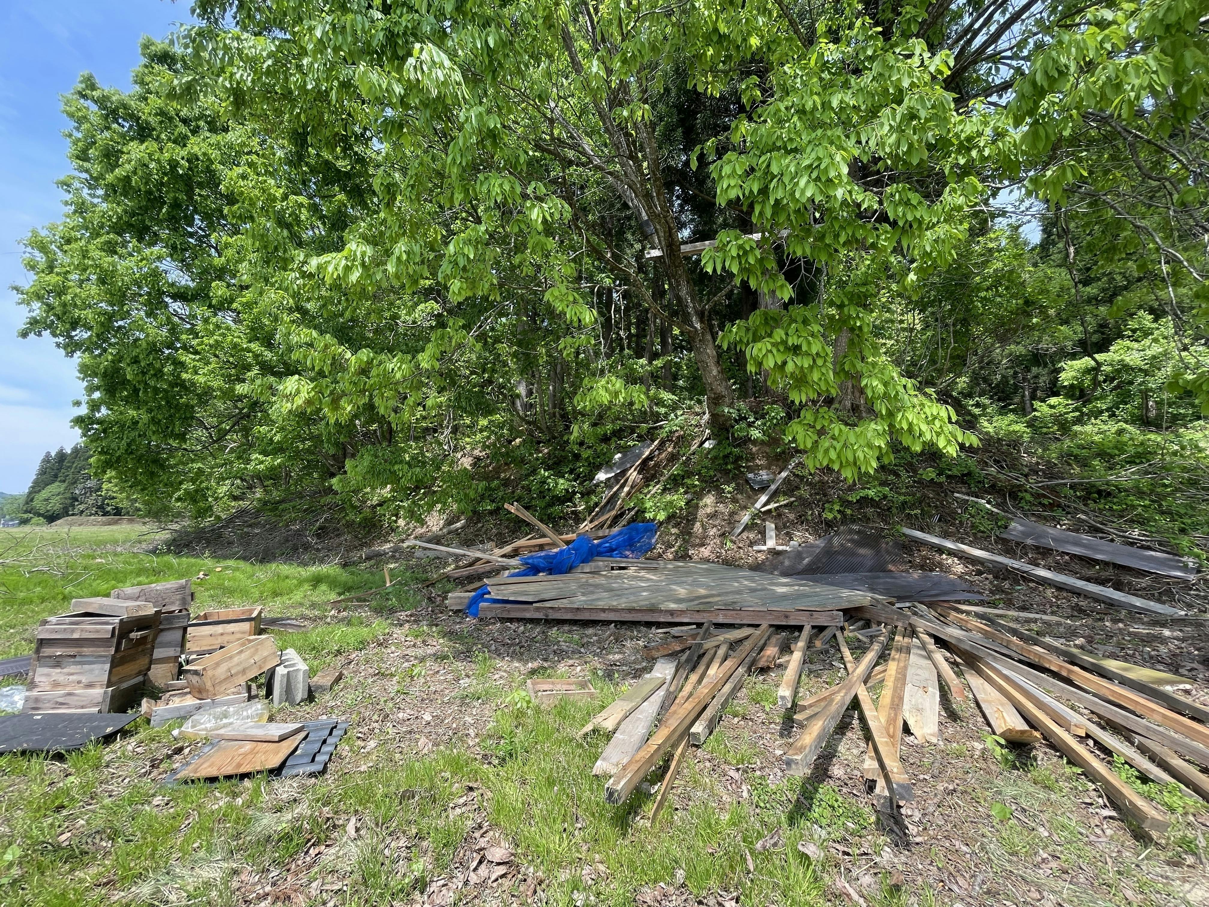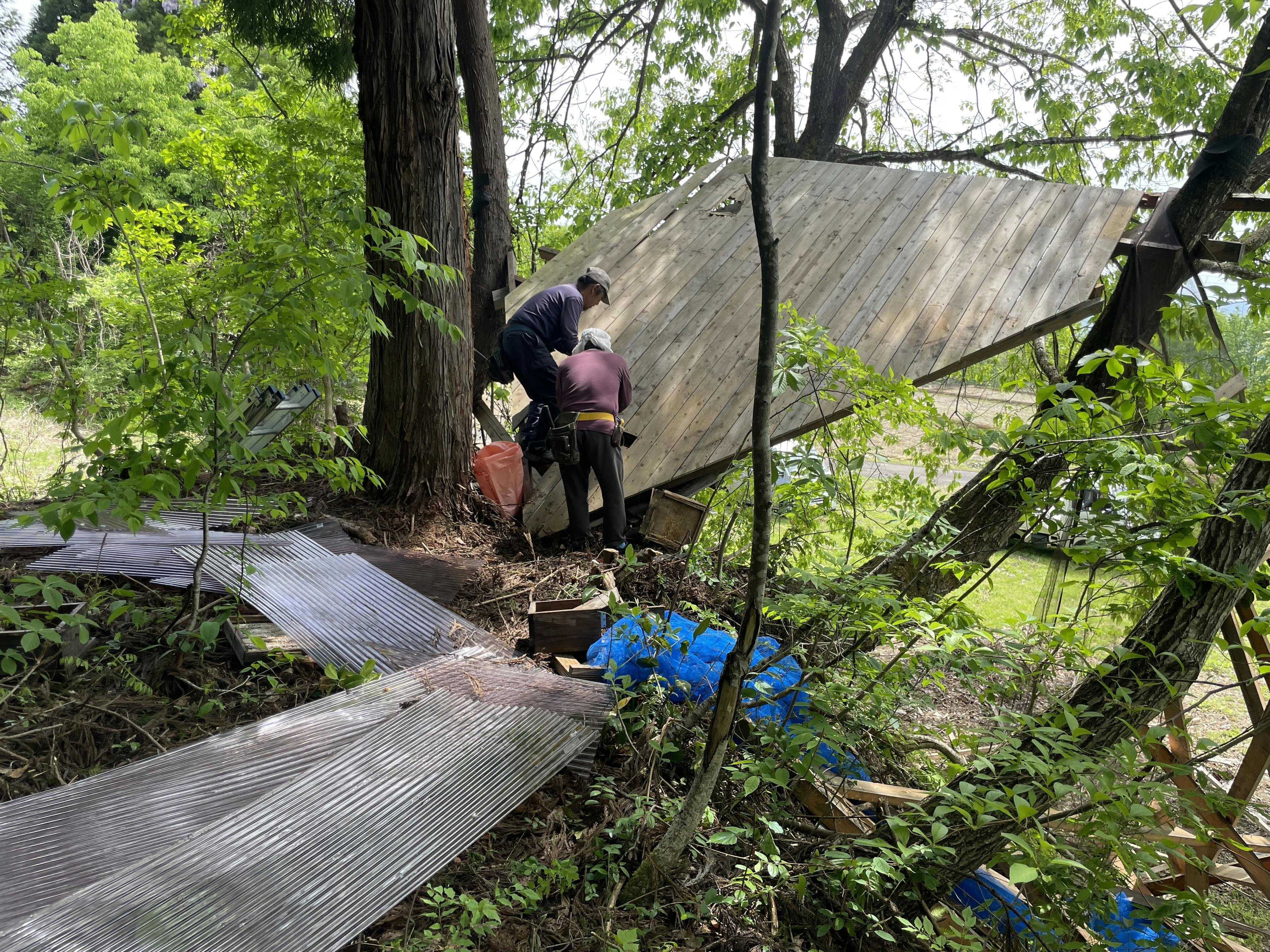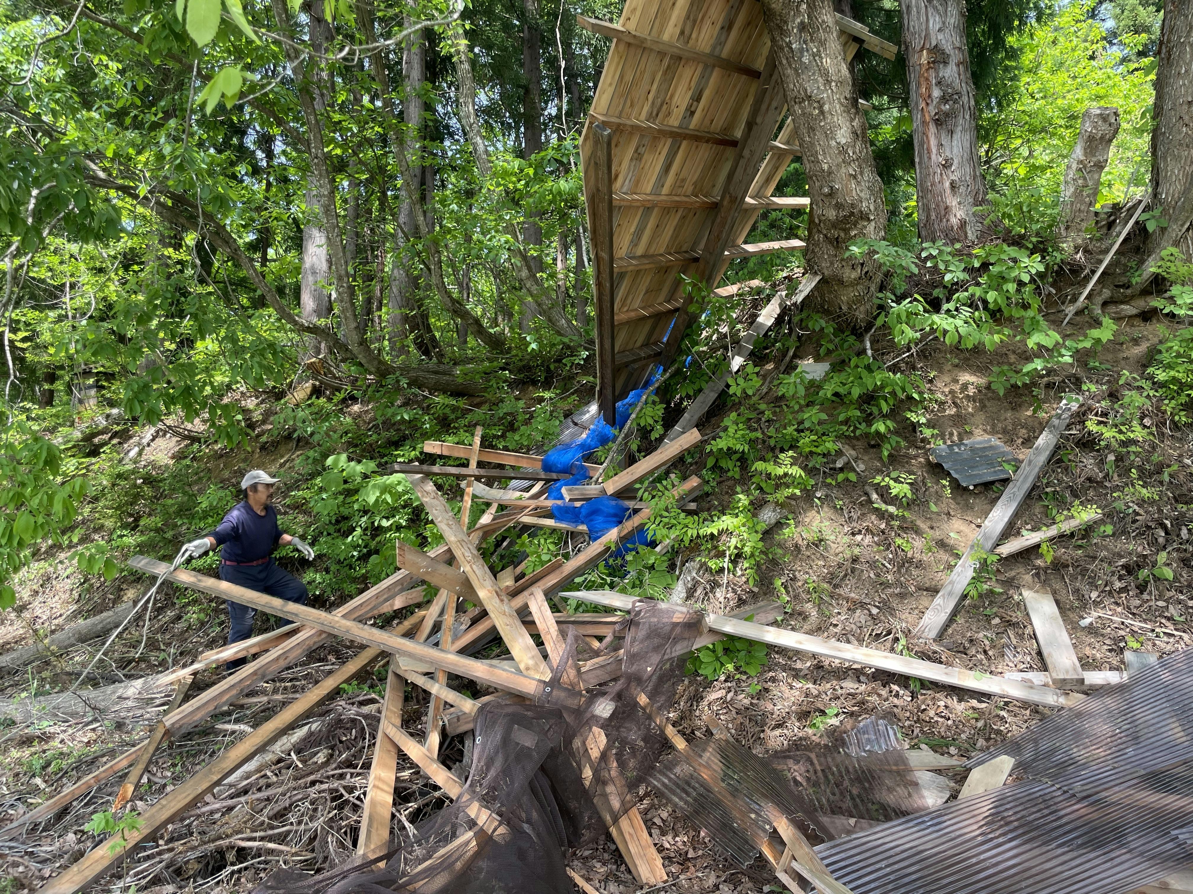 最終的には、引っかかっていた枝や木を切り落とし、トラックで慎重に引き下ろして撤去完了。釘やビスを取り除きながら、使える材料と処分する材料に分けて整理しています。