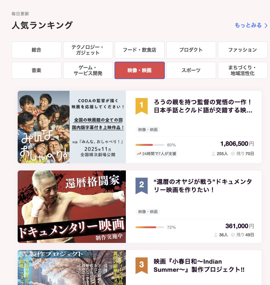 そして、今ふと思い立って確認してみたら、なんとCAMPFIREの映画部門で、まだ1位でした!!!初日からずっと1位をキープしています。