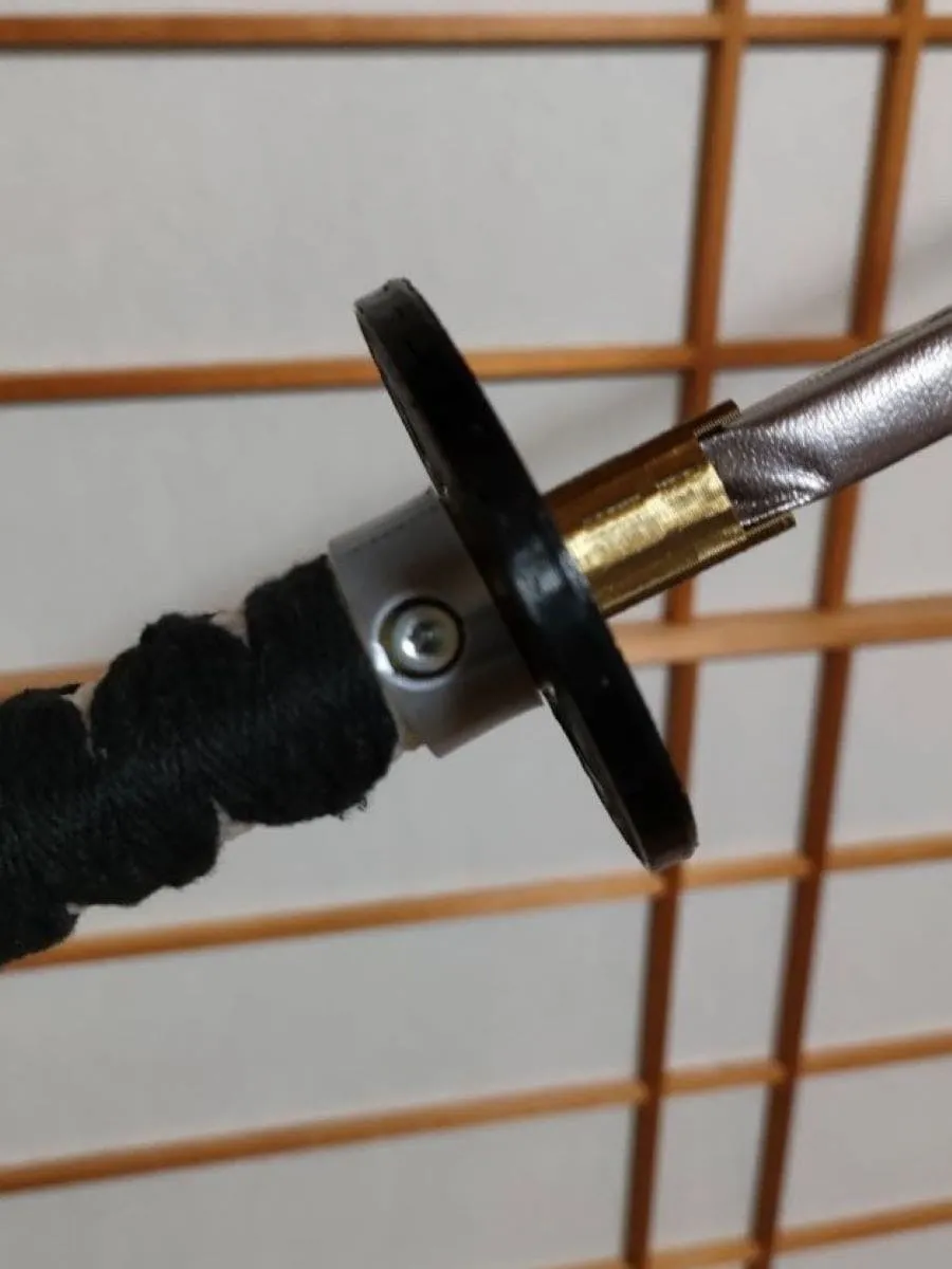 カーボンファイバーに穴を開けることはできない(簡単に折れるようになる)ため、目釘は存在せず、柄頭のところにあるボルトを緩めることで、刀身や鍔を取り外せます。切羽1枚とはばきが一体化しているなど、一部の構造は本物と異なります。