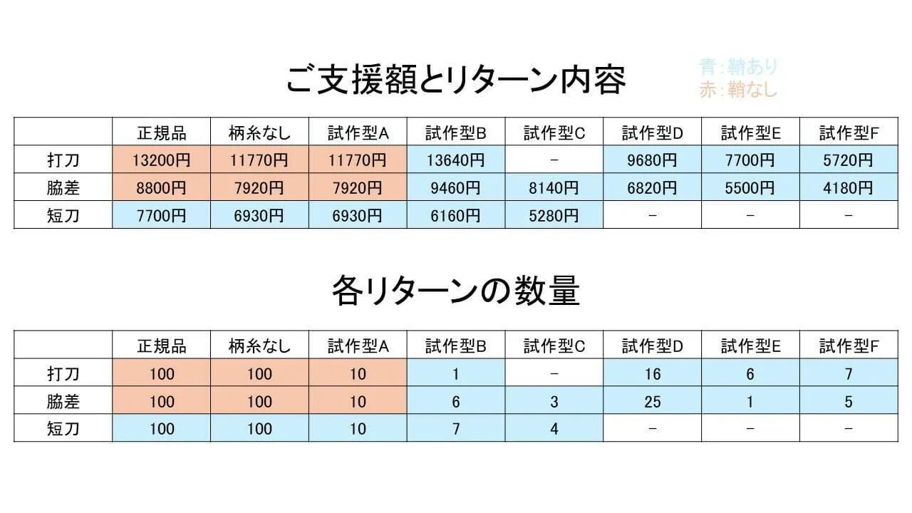 ※打刀、脇差、短刀の3種類すべてで6つの等級があるわけではありません。詳しくは、それぞれのリターンの説明欄を参照してください。