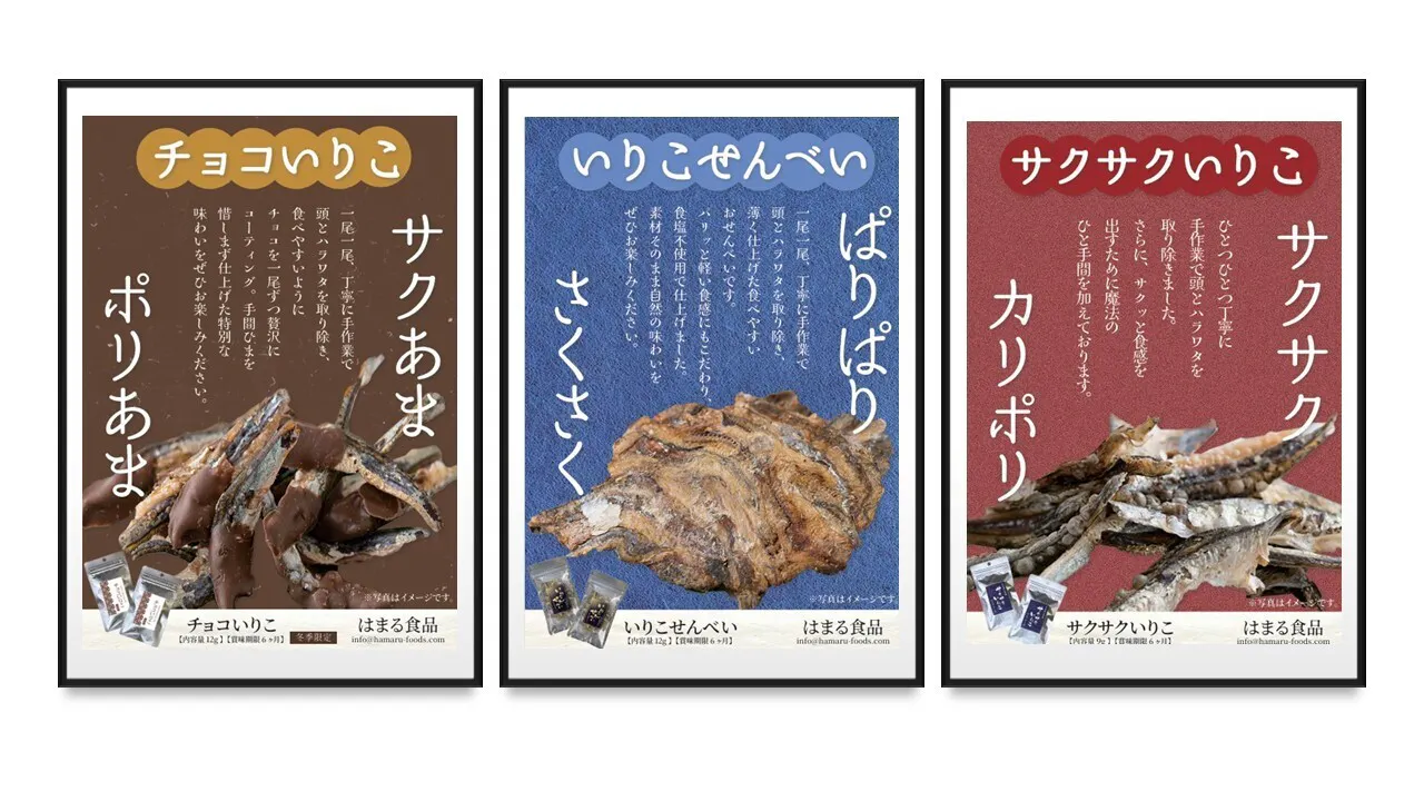 たとえば、「イリコせんべい」「チョコいりこ」「サクサクいりこ」。