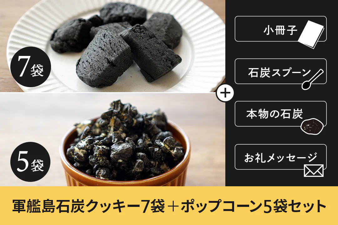 軍艦島石炭クッキー7袋セットと軍艦島石炭ポップコーン30gの5袋セットをお送りさせていただきます。