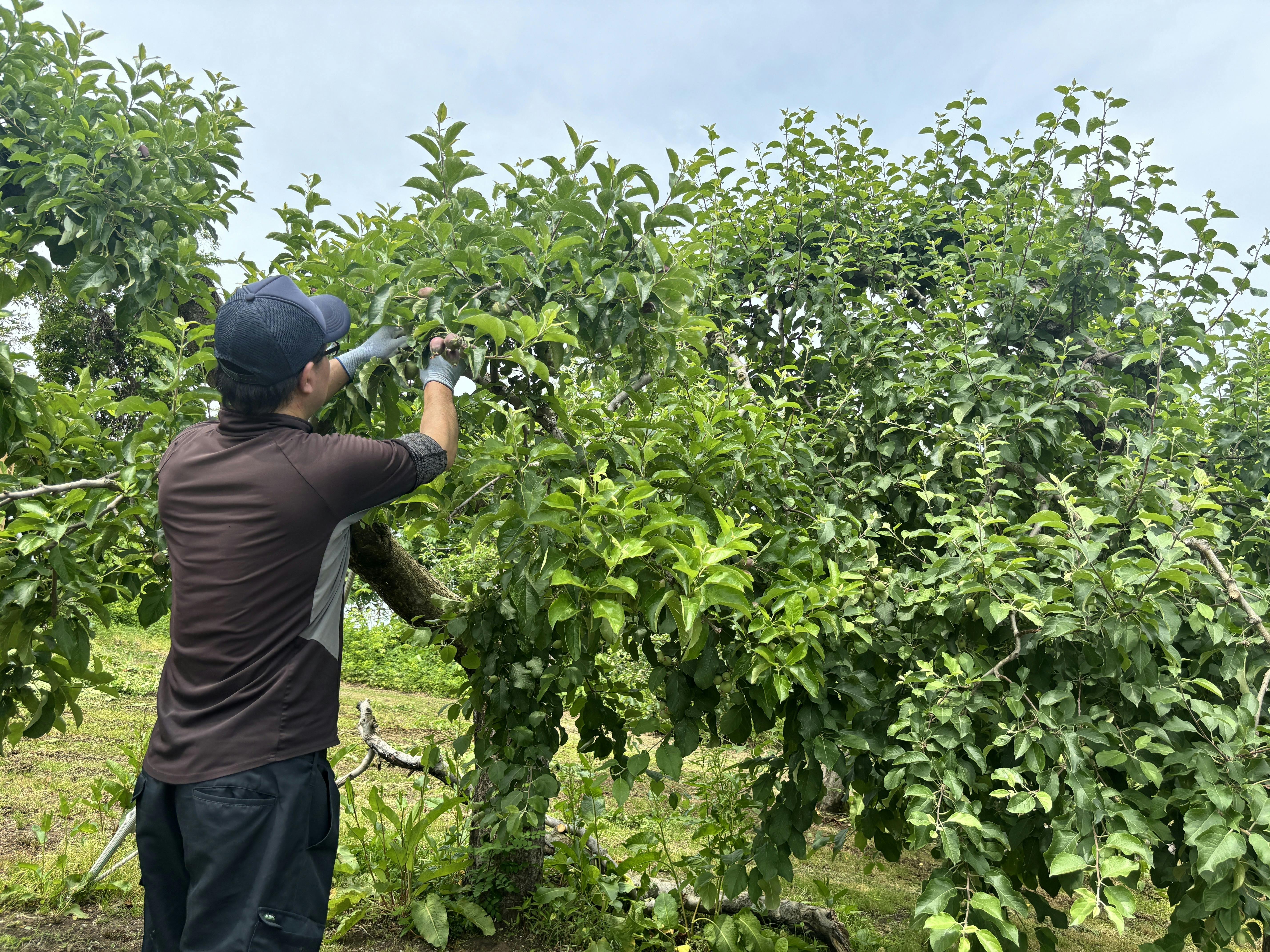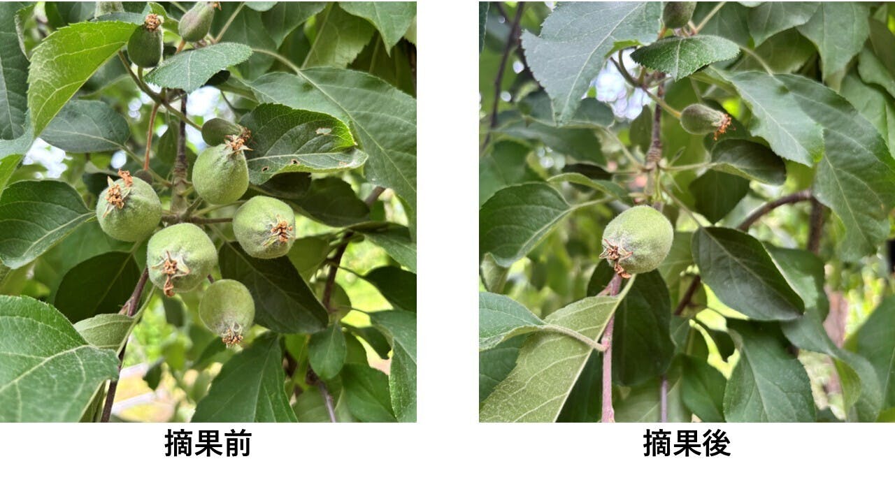 基本的には中心果を残しますが、形や成長度合い、傷の有無などを判断して、時には『側果』を残すこともあります。このような判断を全ての実に対して手作業で行うため、一年の作業の中でも大変な時期になりますが、この摘果は大きく美味しいりんごをお届けするためにとても大切な作業です。