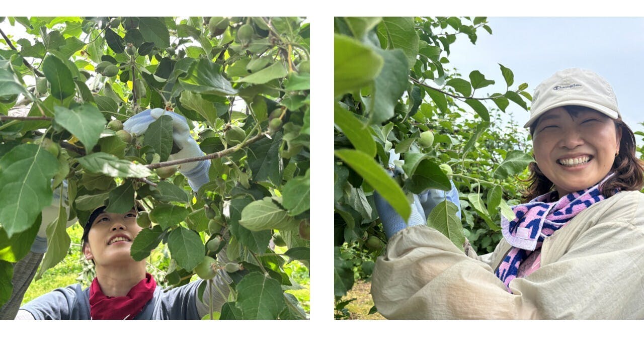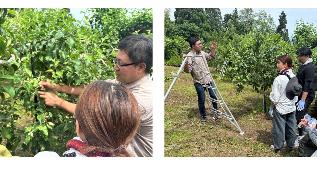 我々3人は大学時代からの友人なのですが、去年の同窓会で我々の農園に興味をもってくれた同期が、青森まで作業体験に来てくれました。体験して頂いた作業は、前回の活動報告で紹介した摘果作業です。作業内容の説明や、斜面での脚立の使い方などの安全面のレクチャーの後に作業をして頂きました。