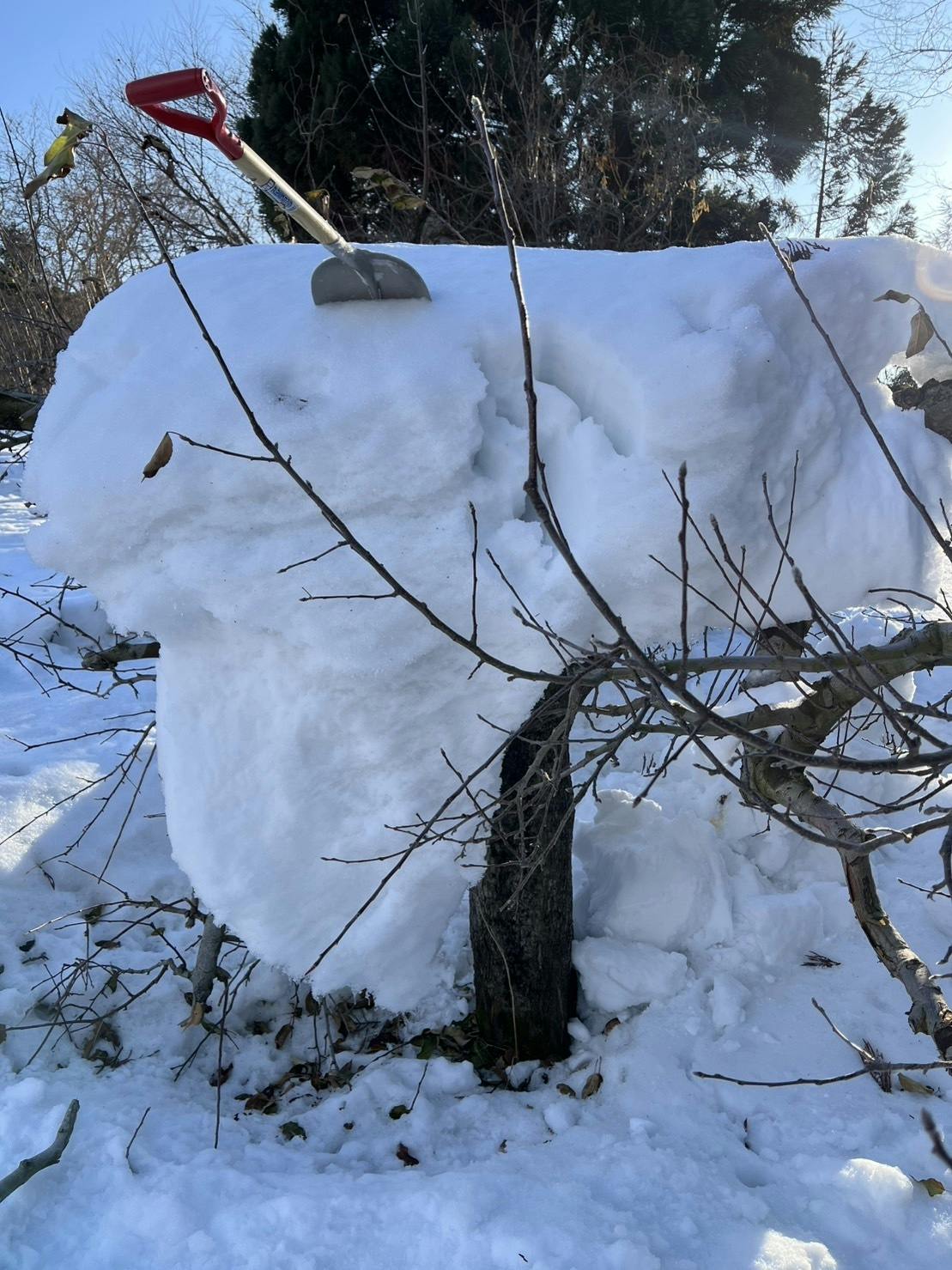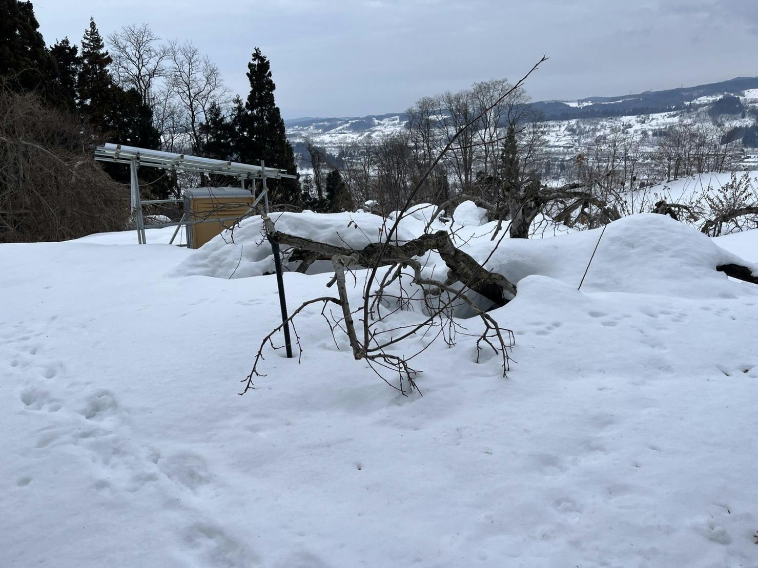 りんご園へ向かうことが出来るようになったのは1月の中旬です。この時点で12月下旬より更に雪が積もり、積雪は2メートルを超えていました。完全に雪に埋もれてしまった木や、雪の重さに耐えきれず折れてしまった枝も多くありました。