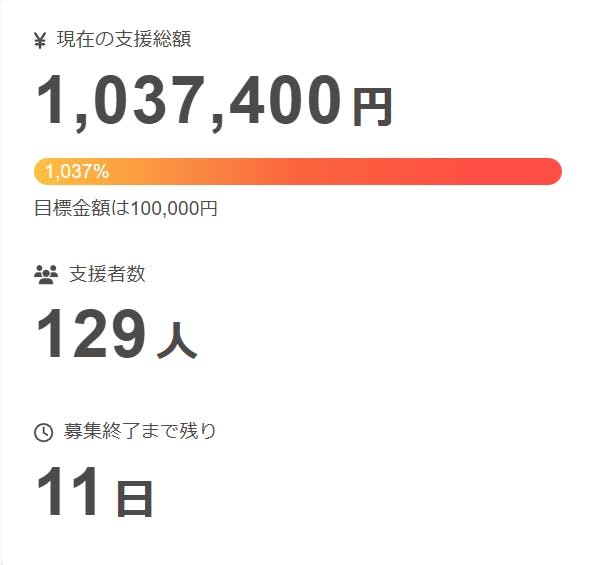 ついに支援金額が100万円を超え、129名もの方にご支援をいただいております。沢山のご支援ありがとうございます。プロジェクト終了まで頑張っていきますので見守って頂けますと幸いです。