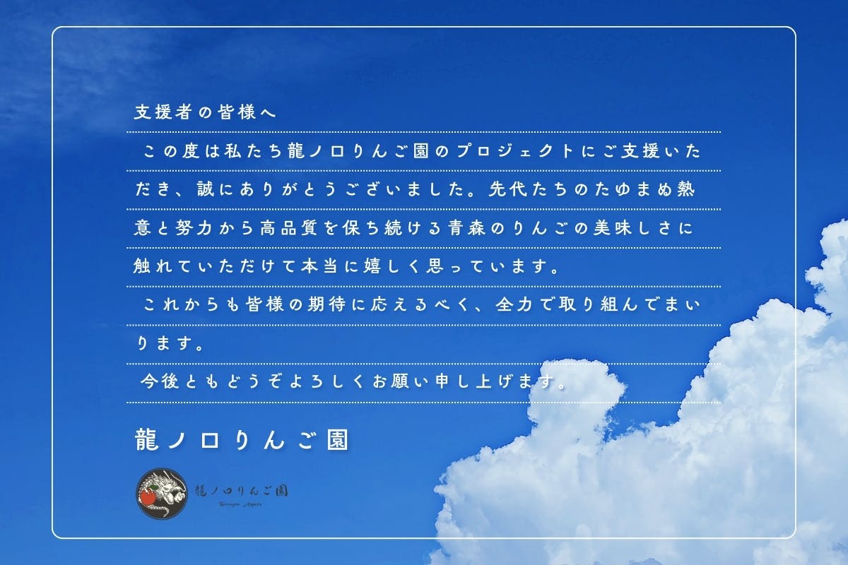 こんにちは。龍ノ口りんご園です。本日はプロジェクト終了日。あと数時間ほどありますが、皆様のお礼をお伝えします。