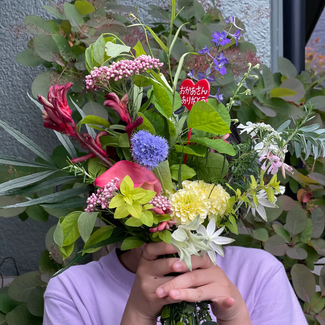 束ねたそれはお花屋さんみたいにきれいな束ではないけど、たった一つのその花束にお母さんは大喜び。