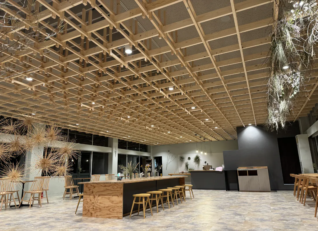 花と建築のセットで、公共施設や店舗の空間デザインから施工まで行うことも。