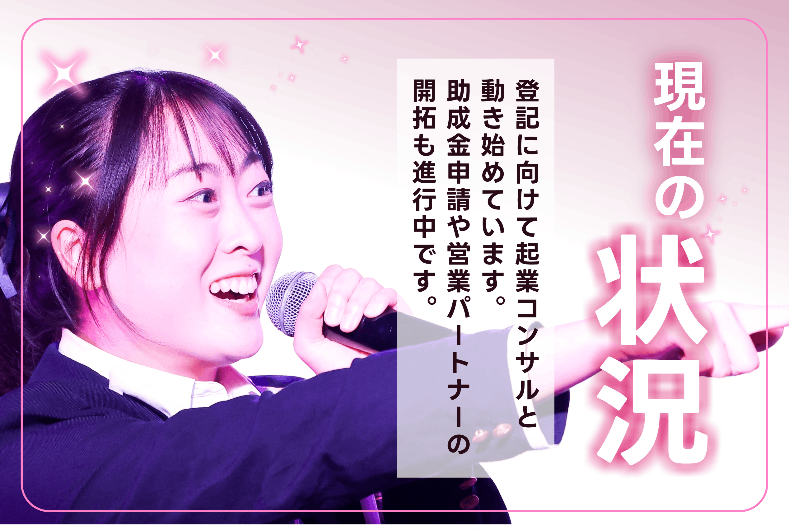 今年中の株式会社登記を目標に現在起業のコンサルの方をつけ、助成金の申請のために東京都内でのコワーキングスペースのレンタル、異業種交流会などに積極的に参加しています。